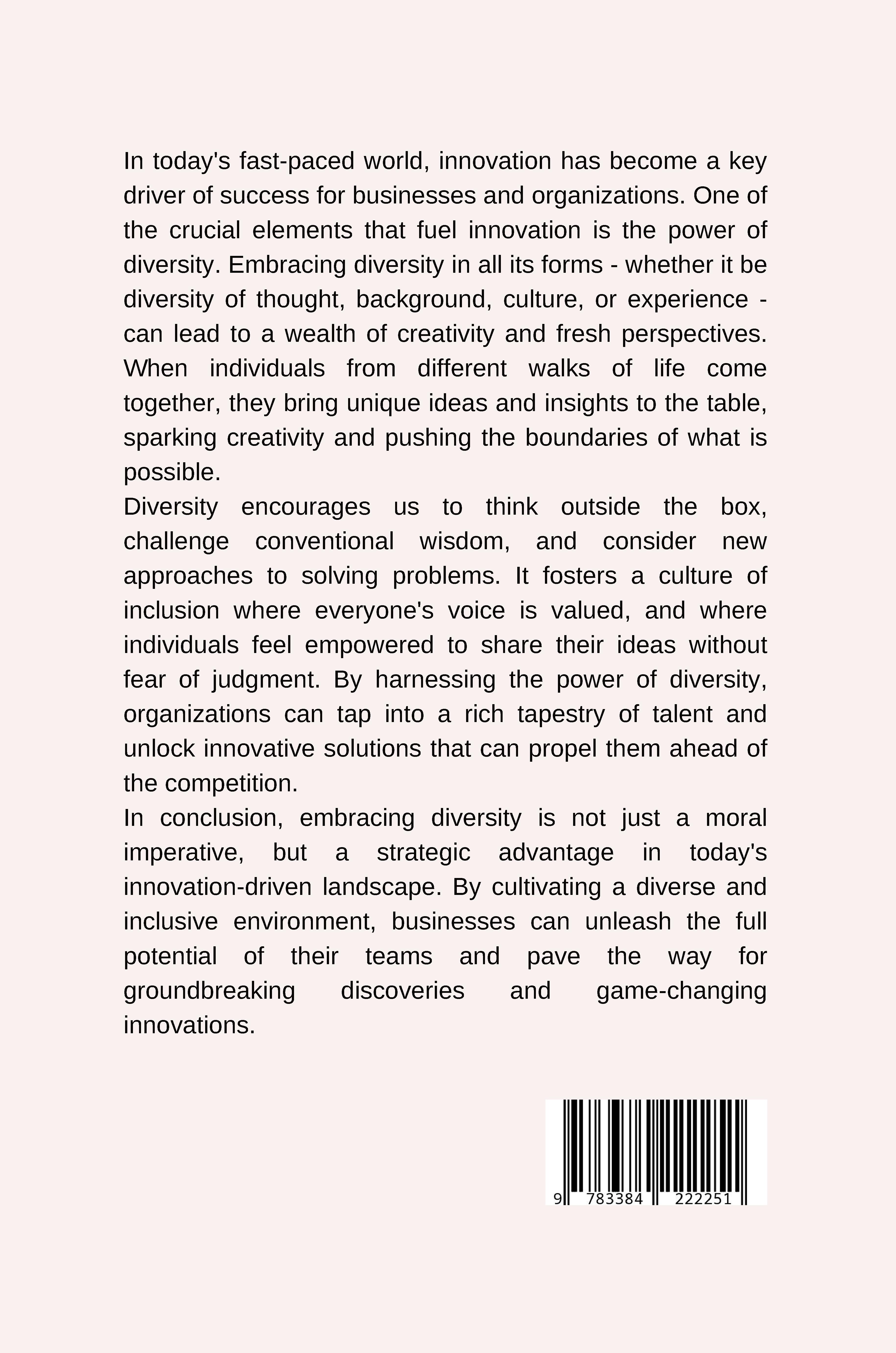 Professor Vani, for your Organizational Leadership course, I propose "Unlocking Talent: Diverse Teams Win." This book challenges the idea that similar teams lead to success. Instead, it champions diversity and inclusion, demonstrating how a variety of backgrounds, experiences, and perspectives fuel high-performing teams. "Unlocking Talent" dives into the science behind diversity, revealing how teams with different thinking styles achieve greater innovation and problem-solving. It equips leaders with tools to cultivate psychological safety, where open communication thrives across differences. But this book goes beyond theory. We'll explore practical strategies to manage unconscious bias, promote team equity, and foster a culture of inclusion where everyone's voice matters. Effective communication is key, and the book equips you to bridge communication gaps in diverse teams. Finally, "Unlocking Talent" emphasizes the leader's role in nurturing talent across a diverse workforce. By creating an environment where everyone feels empowered to contribute, leaders unlock the immense potential that diversity offers for success in today's globalized world.