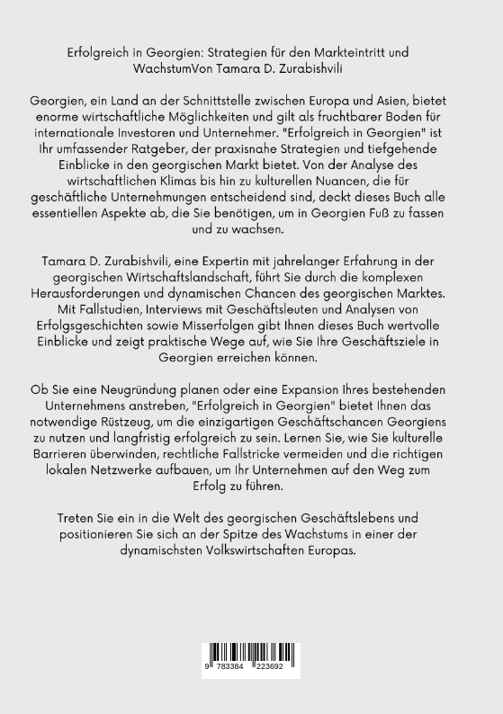 Erfolgreich in Georgien: Strategien für den Markteintritt und WachstumVon Tamara D. ZurabishviliGeorgien, ein Land an der Schnittstelle zwischen Europa und Asien, bietet enorme wirtschaftliche Möglichkeiten und gilt als fruchtbarer Boden für internationale Investoren und Unternehmer. "Erfolgreich in Georgien" ist Ihr umfassender Ratgeber, der praxisnahe Strategien und tiefgehende Einblicke in den georgischen Markt bietet. Von der Analyse des wirtschaftlichen Klimas bis hin zu kulturellen Nuancen, die für geschäftliche Unternehmungen entscheidend sind, deckt dieses Buch alle essentiellen Aspekte ab, die Sie benötigen, um in Georgien Fuß zu fassen und zu wachsen.Tamara D. Zurabishvili, eine Expertin mit jahrelanger Erfahrung in der georgischen Wirtschaftslandschaft, führt Sie durch die komplexen Herausforderungen und dynamischen Chancen des georgischen Marktes. Mit Fallstudien, Interviews mit Geschäftsleuten und Analysen von Erfolgsgeschichten sowie Misserfolgen gibt Ihnen dieses Buch wertvolle Einblicke und zeigt praktische Wege auf, wie Sie Ihre Geschäftsziele in Georgien erreichen können.Ob Sie eine Neugründung planen oder eine Expansion Ihres bestehenden Unternehmens anstreben, "Erfolgreich in Georgien" bietet Ihnen das notwendige Rüstzeug, um die einzigartigen Geschäftschancen Georgiens zu nutzen und langfristig erfolgreich zu sein. Lernen Sie, wie Sie kulturelle Barrieren überwinden, rechtliche Fallstricke vermeiden und die richtigen lokalen Netzwerke aufbauen, um Ihr Unternehmen auf den Weg zum Erfolg zu führen.Treten Sie ein in die Welt des georgischen Geschäftslebens und positionieren Sie sich an der Spitze des Wachstums in einer der dynamischsten Volkswirtschaften Europas.