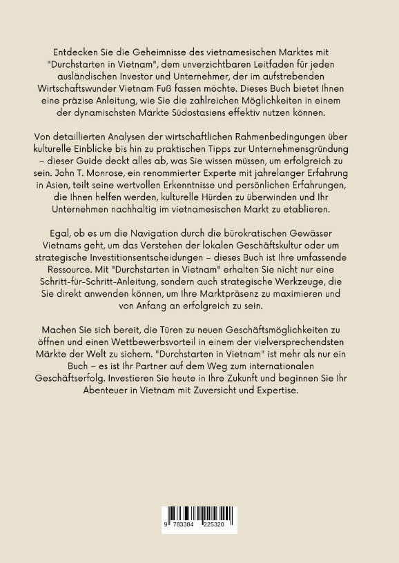 Entdecken Sie die Geheimnisse des vietnamesischen Marktes mit "Durchstarten in Vietnam", dem unverzichtbaren Leitfaden für jeden ausländischen Investor und Unternehmer, der im aufstrebenden Wirtschaftswunder Vietnam Fuß fassen möchte. Dieses Buch bietet Ihnen eine präzise Anleitung, wie Sie die zahlreichen Möglichkeiten in einem der dynamischsten Märkte Südostasiens effektiv nutzen können.Von detaillierten Analysen der wirtschaftlichen Rahmenbedingungen über kulturelle Einblicke bis hin zu praktischen Tipps zur Unternehmensgründung - dieser Guide deckt alles ab, was Sie wissen müssen, um erfolgreich zu sein. John T. Monrose, ein renommierter Experte mit jahrelanger Erfahrung in Asien, teilt seine wertvollen Erkenntnisse und persönlichen Erfahrungen, die Ihnen helfen werden, kulturelle Hürden zu überwinden und Ihr Unternehmen nachhaltig im vietnamesischen Markt zu etablieren.Egal, ob es um die Navigation durch die bürokratischen Gewässer Vietnams geht, um das Verstehen der lokalen Geschäftskultur oder um strategische Investitionsentscheidungen - dieses Buch ist Ihre umfassende Ressource. Mit "Durchstarten in Vietnam" erhalten Sie nicht nur eine Schritt-für-Schritt-Anleitung, sondern auch strategische Werkzeuge, die Sie direkt anwenden können, um Ihre Marktpräsenz zu maximieren und von Anfang an erfolgreich zu sein.Machen Sie sich bereit, die Türen zu neuen Geschäftsmöglichkeiten zu öffnen und einen Wettbewerbsvorteil in einem der vielversprechendsten Märkte der Welt zu sichern. "Durchstarten in Vietnam" ist mehr als nur ein Buch - es ist Ihr Partner auf dem Weg zum internationalen Geschäftserfolg. Investieren Sie heute in Ihre Zukunft und beginnen Sie Ihr Abenteuer in Vietnam mit Zuversicht und Expertise.