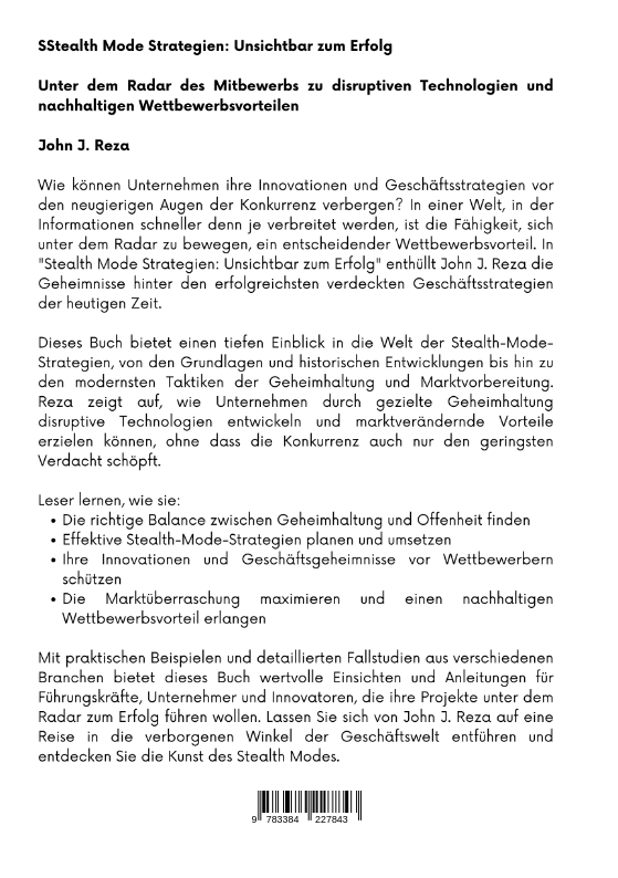 Stealth Mode Strategien: Unsichtbar zum ErfolgUnter dem Radar des Mitbewerbs zu disruptiven Technologien und nachhaltigen WettbewerbsvorteilenJohn J. RezaWie können Unternehmen ihre Innovationen und Geschäftsstrategien vor den neugierigen Augen der Konkurrenz verbergen? In einer Welt, in der Informationen schneller denn je verbreitet werden, ist die Fähigkeit, sich unter dem Radar zu bewegen, ein entscheidender Wettbewerbsvorteil. In "Stealth Mode Strategien: Unsichtbar zum Erfolg" enthüllt John J. Reza die Geheimnisse hinter den erfolgreichsten verdeckten Geschäftsstrategien der heutigen Zeit.Dieses Buch bietet einen tiefen Einblick in die Welt der Stealth-Mode-Strategien, von den Grundlagen und historischen Entwicklungen bis hin zu den modernsten Taktiken der Geheimhaltung und Marktvorbereitung. Reza zeigt auf, wie Unternehmen durch gezielte Geheimhaltung disruptive Technologien entwickeln und marktverändernde Vorteile erzielen können, ohne dass die Konkurrenz auch nur den geringsten Verdacht schöpft.Leser lernen, wie sie:* Die richtige Balance zwischen Geheimhaltung und Offenheit finden* Effektive Stealth-Mode-Strategien planen und umsetzen* Ihre Innovationen und Geschäftsgeheimnisse vor Wettbewerbern schützen* Die Marktüberraschung maximieren und einen nachhaltigen Wettbewerbsvorteil erlangenMit praktischen Beispielen und detaillierten Fallstudien aus verschiedenen Branchen bietet dieses Buch wertvolle Einsichten und Anleitungen für Führungskräfte, Unternehmer und Innovatoren, die ihre Projekte unter dem Radar zum Erfolg führen wollen. Lassen Sie sich von John J. Reza auf eine Reise in die verborgenen Winkel der Geschäftswelt entführen und entdecken Sie die Kunst des Stealth Modes.