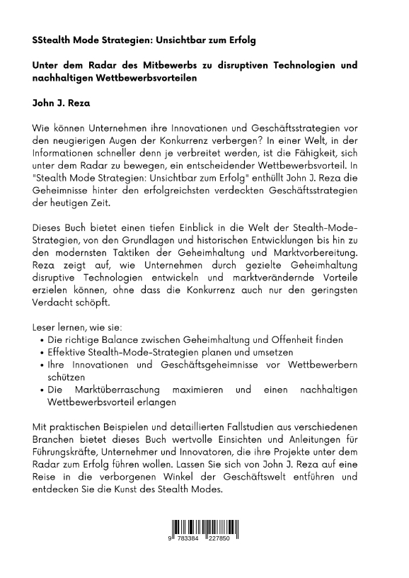 Stealth Mode Strategien: Unsichtbar zum ErfolgUnter dem Radar des Mitbewerbs zu disruptiven Technologien und nachhaltigen WettbewerbsvorteilenJohn J. RezaWie können Unternehmen ihre Innovationen und Geschäftsstrategien vor den neugierigen Augen der Konkurrenz verbergen? In einer Welt, in der Informationen schneller denn je verbreitet werden, ist die Fähigkeit, sich unter dem Radar zu bewegen, ein entscheidender Wettbewerbsvorteil. In "Stealth Mode Strategien: Unsichtbar zum Erfolg" enthüllt John J. Reza die Geheimnisse hinter den erfolgreichsten verdeckten Geschäftsstrategien der heutigen Zeit.Dieses Buch bietet einen tiefen Einblick in die Welt der Stealth-Mode-Strategien, von den Grundlagen und historischen Entwicklungen bis hin zu den modernsten Taktiken der Geheimhaltung und Marktvorbereitung. Reza zeigt auf, wie Unternehmen durch gezielte Geheimhaltung disruptive Technologien entwickeln und marktverändernde Vorteile erzielen können, ohne dass die Konkurrenz auch nur den geringsten Verdacht schöpft.Leser lernen, wie sie:* Die richtige Balance zwischen Geheimhaltung und Offenheit finden* Effektive Stealth-Mode-Strategien planen und umsetzen* Ihre Innovationen und Geschäftsgeheimnisse vor Wettbewerbern schützen* Die Marktüberraschung maximieren und einen nachhaltigen Wettbewerbsvorteil erlangenMit praktischen Beispielen und detaillierten Fallstudien aus verschiedenen Branchen bietet dieses Buch wertvolle Einsichten und Anleitungen für Führungskräfte, Unternehmer und Innovatoren, die ihre Projekte unter dem Radar zum Erfolg führen wollen. Lassen Sie sich von John J. Reza auf eine Reise in die verborgenen Winkel der Geschäftswelt entführen und entdecken Sie die Kunst des Stealth Modes.