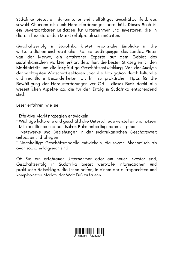 Südafrika bietet ein dynamisches und vielfältiges Geschäftsumfeld, das sowohl Chancen als auch Herausforderungen bereithält. Dieses Buch ist ein unverzichtbarer Leitfaden für Unternehmer und Investoren, die in diesem faszinierenden Markt erfolgreich sein möchten.Geschäftserfolg in Südafrika bietet praxisnahe Einblicke in die wirtschaftlichen und rechtlichen Rahmenbedingungen des Landes. Pieter van der Merwe, ein erfahrener Experte auf dem Gebiet des südafrikanischen Marktes, erklärt detailliert die besten Strategien für den Markteintritt und die langfristige Geschäftsentwicklung. Von der Analyse der wichtigsten Wirtschaftssektoren über die Navigation durch kulturelle und rechtliche Besonderheiten bis hin zu praktischen Tipps für die Bewältigung der Herausforderungen vor Ort - dieses Buch deckt alle wesentlichen Aspekte ab, die für den Erfolg in Südafrika entscheidend sind.Leser erfahren, wie sie:* Effektive Marktstrategien entwickeln* Wichtige kulturelle und geschäftliche Unterschiede verstehen und nutzen* Mit rechtlichen und politischen Rahmenbedingungen umgehen* Netzwerke und Beziehungen in der südafrikanischen Geschäftswelt aufbauen und pflegen* Nachhaltige Geschäftsmodelle entwickeln, die sowohl ökonomisch als auch sozial erfolgreich sindOb Sie ein erfahrener Unternehmer oder ein neuer Investor sind, Geschäftserfolg in Südafrika bietet wertvolle Informationen und praktische Ratschläge, die Ihnen helfen, in einem der aufregendsten und komplexesten Märkte der Welt Fuß zu fassen.