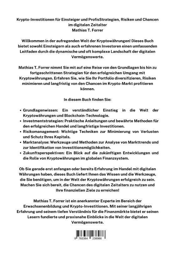 Willkommen in der aufregenden Welt der Kryptowährungen! Dieses Buch bietet sowohl Einsteigern als auch erfahrenen Investoren einen umfassenden Leitfaden durch die dynamische und oft komplexe Landschaft der digitalen Vermögenswerte.Mathias T. Forrer nimmt Sie mit auf eine Reise von den Grundlagen bis hin zu fortgeschrittenen Strategien für den erfolgreichen Umgang mit Kryptowährungen. Erfahren Sie, wie Sie Ihr Portfolio diversifizieren, Risiken minimieren und langfristig von den Chancen im Krypto-Markt profitieren können.In diesem Buch finden Sie:* Grundlagenwissen: Ein verständlicher Einstieg in die Welt der Kryptowährungen und Blockchain-Technologie.* Investmentstrategien: Praktische Anleitungen und bewährte Methoden für den erfolgreichen Handel und langfristige Investitionen.* Risikomanagement: Wichtige Techniken zur Minimierung von Verlusten und Schutz Ihres Kapitals.* Marktanalyse: Werkzeuge und Methoden zur Analyse von Markttrends und zur Identifikation von Investitionsmöglichkeiten.* Zukunftsperspektiven: Ein Blick auf die zukünftigen Entwicklungen und die Rolle von Kryptowährungen im globalen Finanzsystem.Ob Sie gerade erst anfangen oder bereits Erfahrung im Handel mit digitalen Währungen haben, dieses Buch liefert Ihnen das Wissen und die Werkzeuge, die Sie benötigen, um in der Welt der Kryptowährungen erfolgreich zu sein. Machen Sie sich bereit, die Chancen des digitalen Zeitalters zu nutzen und Ihre finanziellen Ziele zu erreichen!Mathias T. Forrer ist ein anerkannter Experte im Bereich der Erwachsenenbildung und Krypto-Investitionen. Mit seiner langjährigen Erfahrung und seinem tiefen Verständnis für die Finanzmärkte bietet er seinen Lesern fundierte und praxisnahe Einblicke in die Welt der digitalen Vermögenswerte.