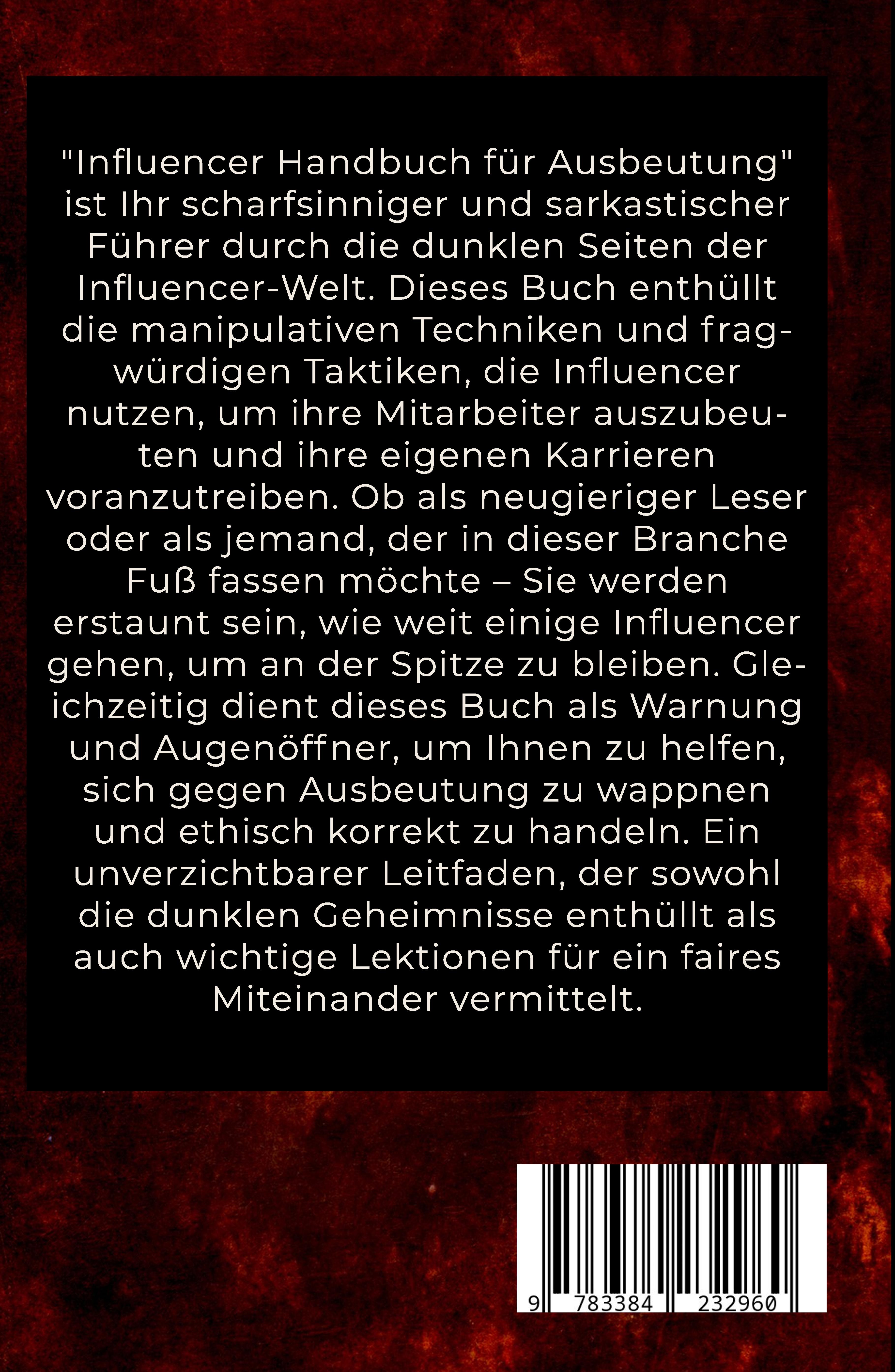 Tauche ein in die faszinierende und oft gnadenlose Welt der Influencer mit dem "Influencer Handbuch für Ausbeutung ".Vermutlich hat dich deine Neugier oder dein Ehrgeiz hierhergeführt, um die dunklen Geheimnisse der Influencer-Branche zu entdecken. Hast du dich jemals gefragt, wie erfolgreiche Influencer es schaffen, ihre Mitarbeiter zu Höchstleistungen zu treiben, während sie selbst im Rampenlicht stehen? Bist du bereit, die scharfsinnigen, manchmal skrupellosen Taktiken kennenzulernen, die hinter den Kulissen angewendet werden?Dieser Leitfaden ist dein Schlüssel zu einem tiefen Verständnis dieser Mechanismen.Entdecke die verborgenen Strategien der Influencer-EliteStelle dir vor, du könntest die geheimen Methoden und Tricks der erfolgreichsten Influencer anwenden. Dieses Buch deckt die Techniken auf, mit denen Influencer ihre Mitarbeiter manipulieren und motivieren, ohne dabei selbst an Popularität zu verlieren. Es zeigt dir nicht nur, wie du die Effizienz deines Teams maximieren kannst, sondern auch, wie du deine eigene Karriere auf das nächste Level bringst.Das erwartet dich im "Influencer Handbuch für Ausbeutung"- Manipulative Rekrutierungstechniken: Lerne, wie du talentierte Amateure findest und für deine Zwecke einsetzt.- Psychologische Kontrolle: Entdecke, wie du durch geschickte Manipulation und subtile Drohungen deine Mitarbeiter in Abhängigkeit hältst- Selbstdarstellung und Imagepflege: Erfahre, wie du dich selbst als humorvoller und überforderter Chef inszenierst, um Kritik abzuwehren und Sympathie zu gewinnen.Dieses Buch mag auf den ersten Blick wie eine sarkastische Anleitung wirken, doch es basiert auf realen Vorgängen und Erfahrungen innerhalb der Influencer-Branche. Es dient dazu, ein Bewusstsein für diese Dynamiken zu schaffen und zukünftige Missstände zu verhindern.Bestelle jetzt dein Exemplar und erhalte einen tiefen Einblick in die wahre Welt der Influencer, um zu lernen, wie du dich entweder schützen oder erfolgreich führen kannst