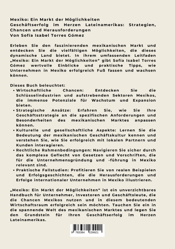 Mexiko: Ein Markt der MöglichkeitenGeschäftserfolg im Herzen Lateinamerikas: Strategien, Chancen und HerausforderungenVon Sofía Isabel Torres GómezErleben Sie den faszinierenden mexikanischen Markt und entdecken Sie die vielfältigen Möglichkeiten, die dieses dynamische Land bietet. In ihrem umfassenden Leitfaden "Mexiko: Ein Markt der Möglichkeiten" gibt Sofía Isabel Torres Gómez wertvolle Einblicke und praktische Tipps, wie Unternehmen in Mexiko erfolgreich Fuß fassen und wachsen können.Dieses Buch beleuchtet:* Wirtschaftliche Chancen: Entdecken Sie die Schlüsselindustrien und aufstrebenden Sektoren Mexikos, die immense Potenziale für Wachstum und Expansion bieten.* Strategische Ansätze: Erfahren Sie, wie Sie Ihre Geschäftsstrategie an die spezifischen Anforderungen und Besonderheiten des mexikanischen Marktes anpassen können.* Kulturelle und gesellschaftliche Aspekte: Lernen Sie die Bedeutung der mexikanischen Geschäftskultur kennen und verstehen Sie, wie Sie erfolgreich mit lokalen Partnern und Kunden interagieren.* Rechtliche Rahmenbedingungen: Navigieren Sie sicher durch das komplexe Geflecht von Gesetzen und Vorschriften, die für die Unternehmensgründung und -führung in Mexiko relevant sind.* Praktische Fallstudien: Profitieren Sie von realen Beispielen und Erfolgsgeschichten, die die Herausforderungen und Erfolge internationaler Unternehmen in Mexiko illustrieren."Mexiko: Ein Markt der Möglichkeiten" ist ein unverzichtbares Handbuch für Unternehmer, Investoren und Geschäftsleute, die die Chancen Mexikos nutzen und in diesem bedeutenden Wirtschaftsraum erfolgreich sein möchten. Tauchen Sie ein in die spannende Welt des mexikanischen Marktes und legen Sie den Grundstein für Ihren Geschäftserfolg im Herzen Lateinamerikas.