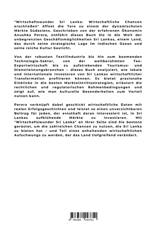 "Wirtschaftswunder Sri Lanka: Wirtschaftliche Chancen erschließen" öffnet die Tore zu einem der dynamischsten Märkte Südasiens. Geschrieben von der erfahrenen Ökonomin Anushka Perera, entführt dieses Buch Sie in die Welt der unbegrenzten Geschäftsmöglichkeiten Sri Lankas, einem Land, das durch seine strategische Lage im Indischen Ozean und seine reiche Kultur besticht.Von der robusten Textilindustrie bis hin zum boomenden Technologie-Sektor, von der weltberühmten Tee-Exportwirtschaft bis zu aufstrebenden Tourismus- und Dienstleistungsbranchen - dieses Buch analysiert, wie lokale und internationale Investoren von Sri Lankas wirtschaftlicher Transformation profitieren können. Es bietet praxisnahe Einblicke in die besten Markteintrittsstrategien, erläutert die rechtlichen und regulatorischen Rahmenbedingungen und zeigt auf, wie man kulturelle Besonderheiten zum Vorteil nutzen kann.Perera verknüpft dabei geschickt wirtschaftliche Daten mit realen Erfolgsgeschichten und leistet so einen unverzichtbaren Beitrag für jeden, der ernsthaft daran interessiert ist, in Sri Lankas aufblühende Märkte zu investieren. Mit "Wirtschaftswunder Sri Lanka" an Ihrer Seite sind Sie bestens gerüstet, um die zahlreichen Chancen zu nutzen, die Sri Lanka zu bieten hat - und Teil eines anhaltenden wirtschaftlichen Aufschwungs zu werden, der das Land tiefgreifend verändert.