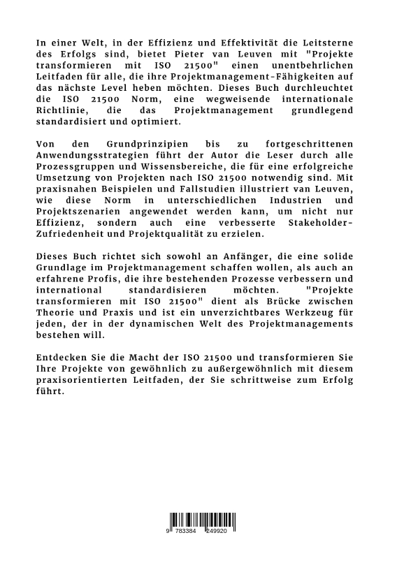 In einer Welt, in der Effizienz und Effektivität die Leitsterne des Erfolgs sind, bietet Pieter van Leuven mit "Projekte transformieren mit ISO 21500" einen unentbehrlichen Leitfaden für alle, die ihre Projektmanagement-Fähigkeiten auf das nächste Level heben möchten. Dieses Buch durchleuchtet die ISO 21500 Norm, eine wegweisende internationale Richtlinie, die das Projektmanagement grundlegend standardisiert und optimiert.Von den Grundprinzipien bis zu fortgeschrittenen Anwendungsstrategien führt der Autor die Leser durch alle Prozessgruppen und Wissensbereiche, die für eine erfolgreiche Umsetzung von Projekten nach ISO 21500 notwendig sind. Mit praxisnahen Beispielen und Fallstudien illustriert van Leuven, wie diese Norm in unterschiedlichen Industrien und Projektszenarien angewendet werden kann, um nicht nur Effizienz, sondern auch eine verbesserte Stakeholder-Zufriedenheit und Projektqualität zu erzielen.Dieses Buch richtet sich sowohl an Anfänger, die eine solide Grundlage im Projektmanagement schaffen wollen, als auch an erfahrene Profis, die ihre bestehenden Prozesse verbessern und international standardisieren möchten. "Projekte transformieren mit ISO 21500" dient als Brücke zwischen Theorie und Praxis und ist ein unverzichtbares Werkzeug für jeden, der in der dynamischen Welt des Projektmanagements bestehen will.Entdecken Sie die Macht der ISO 21500 und transformieren Sie Ihre Projekte von gewöhnlich zu außergewöhnlich mit diesem praxisorientierten Leitfaden, der Sie schrittweise zum Erfolg führt.