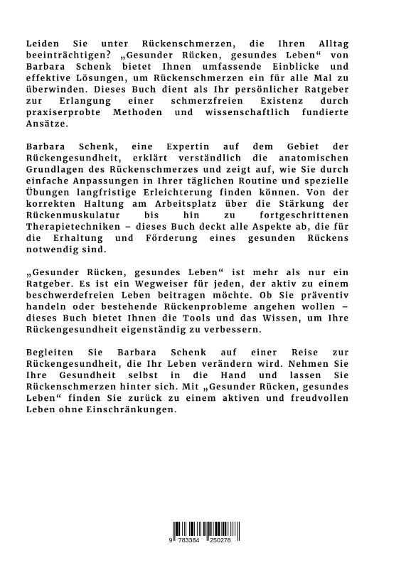 Leiden Sie unter Rückenschmerzen, die Ihren Alltag beeinträchtigen? "Gesunder Rücken, gesundes Leben" von Barbara Schenk bietet Ihnen umfassende Einblicke und effektive Lösungen, um Rückenschmerzen ein für alle Mal zu überwinden. Dieses Buch dient als Ihr persönlicher Ratgeber zur Erlangung einer schmerzfreien Existenz durch praxiserprobte Methoden und wissenschaftlich fundierte Ansätze.Barbara Schenk, eine Expertin auf dem Gebiet der Rückengesundheit, erklärt verständlich die anatomischen Grundlagen des Rückenschmerzes und zeigt auf, wie Sie durch einfache Anpassungen in Ihrer täglichen Routine und spezielle Übungen langfristige Erleichterung finden können. Von der korrekten Haltung am Arbeitsplatz über die Stärkung der Rückenmuskulatur bis hin zu fortgeschrittenen Therapietechniken - dieses Buch deckt alle Aspekte ab, die für die Erhaltung und Förderung eines gesunden Rückens notwendig sind."Gesunder Rücken, gesundes Leben" ist mehr als nur ein Ratgeber. Es ist ein Wegweiser für jeden, der aktiv zu einem beschwerdefreien Leben beitragen möchte. Ob Sie präventiv handeln oder bestehende Rückenprobleme angehen wollen - dieses Buch bietet Ihnen die Tools und das Wissen, um Ihre Rückengesundheit eigenständig zu verbessern.Begleiten Sie Barbara Schenk auf einer Reise zur Rückengesundheit, die Ihr Leben verändern wird. Nehmen Sie Ihre Gesundheit selbst in die Hand und lassen Sie Rückenschmerzen hinter sich. Mit "Gesunder Rücken, gesundes Leben" finden Sie zurück zu einem aktiven und freudvollen Leben ohne Einschränkungen.