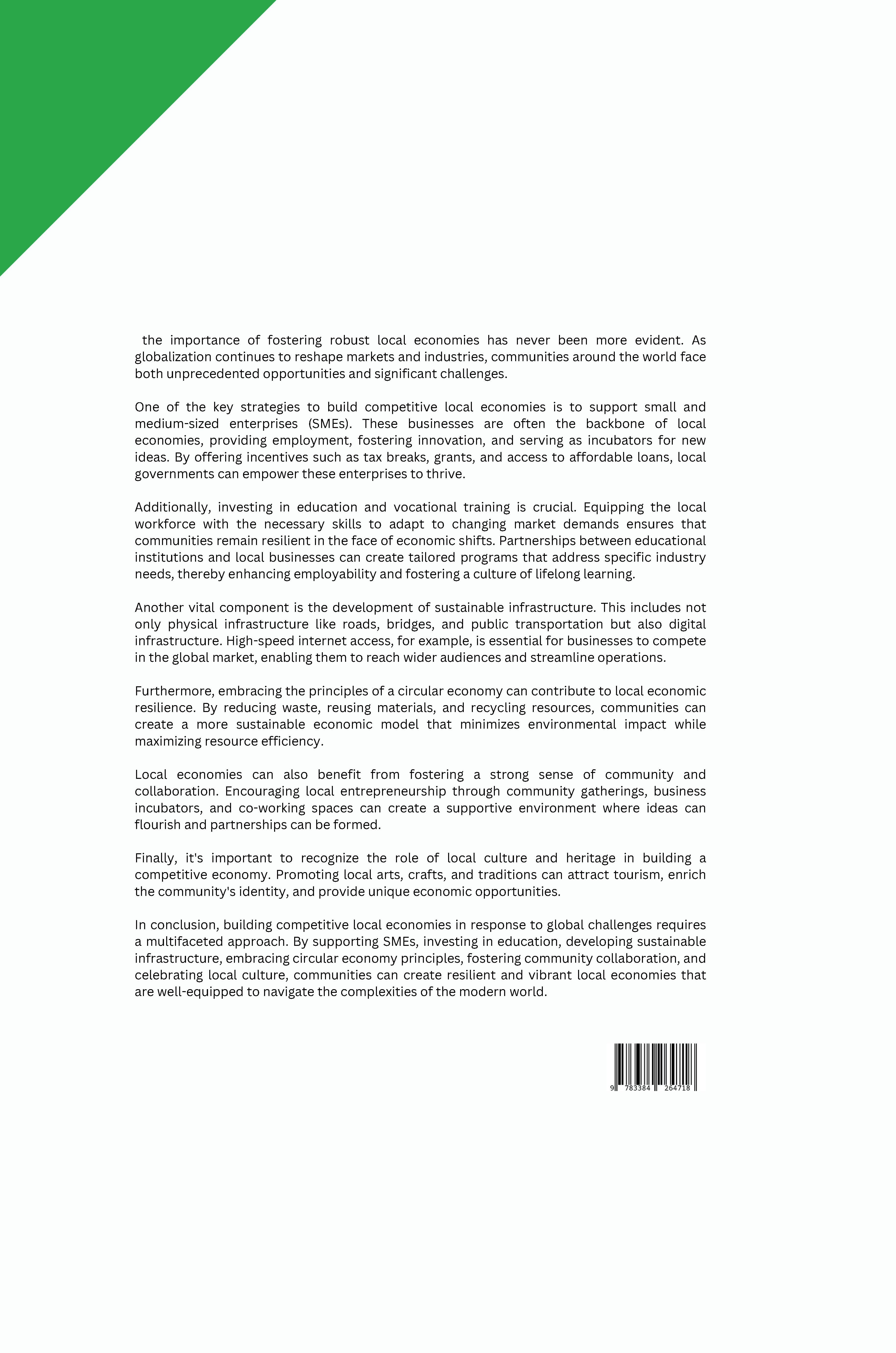 In a world increasingly dominated by global forces, Professor Miguel tackles the crucial role of local economies in his thought-provoking book, "Building Competitive Local Economies: A Response to Global Challenges." This timely work equips policymakers, community leaders, and entrepreneurs with the knowledge and strategies to foster economic vibrancy within their own communities. Professor Miguel, a renowned expert in regional development, argues that strong local economies are the backbone of a thriving global system. He dissects the challenges posed by globalization, including job displacement and corporate outsourcing. However, Professor Miguel doesn't dwell on problems; he offers solutions. "Building Competitive Local Economies" explores a range of practical strategies for fostering local economic development. Professor Miguel emphasizes the importance of investing in human capital through education and skills training programs. He advocates for policies that nurture local businesses, promote innovation, and encourage entrepreneurship. The book delves into the potential of local supply chains, sustainable practices, and leveraging technology to create a competitive edge. Professor Miguel recognizes the importance of collaboration, urging communities to build partnerships with regional stakeholders and leverage unique local assets. "Building Competitive Local Economies" is a blueprint for a more resilient and equitable future. By empowering communities to build strong local economies, Professor Miguel offers a compelling response to the challenges of globalization, fostering prosperity and opportunity from the ground up.