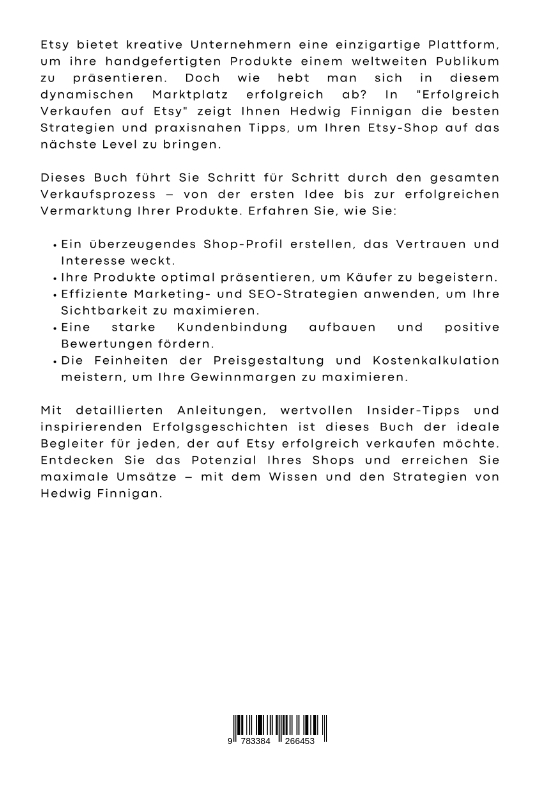 Etsy bietet kreative Unternehmern eine einzigartige Plattform, um ihre handgefertigten Produkte einem weltweiten Publikum zu präsentieren. Doch wie hebt man sich in diesem dynamischen Marktplatz erfolgreich ab? In "Erfolgreich Verkaufen auf Etsy" zeigt Ihnen Hedwig Finnigan die besten Strategien und praxisnahen Tipps, um Ihren Etsy-Shop auf das nächste Level zu bringen.Dieses Buch führt Sie Schritt für Schritt durch den gesamten Verkaufsprozess - von der ersten Idee bis zur erfolgreichen Vermarktung Ihrer Produkte. Erfahren Sie, wie Sie:- Ein überzeugendes Shop-Profil erstellen, das Vertrauen und Interesse weckt.- Ihre Produkte optimal präsentieren, um Käufer zu begeistern.- Effiziente Marketing- und SEO-Strategien anwenden, um Ihre Sichtbarkeit zu maximieren.- Eine starke Kundenbindung aufbauen und positive Bewertungen fördern.- Die Feinheiten der Preisgestaltung und Kostenkalkulation meistern, um Ihre Gewinnmargen zu maximieren.Mit detaillierten Anleitungen, wertvollen Insider-Tipps und inspirierenden Erfolgsgeschichten ist dieses Buch der ideale Begleiter für jeden, der auf Etsy erfolgreich verkaufen möchte. Entdecken Sie das Potenzial Ihres Shops und erreichen Sie maximale Umsätze - mit dem Wissen und den Strategien von Hedwig Finnigan.