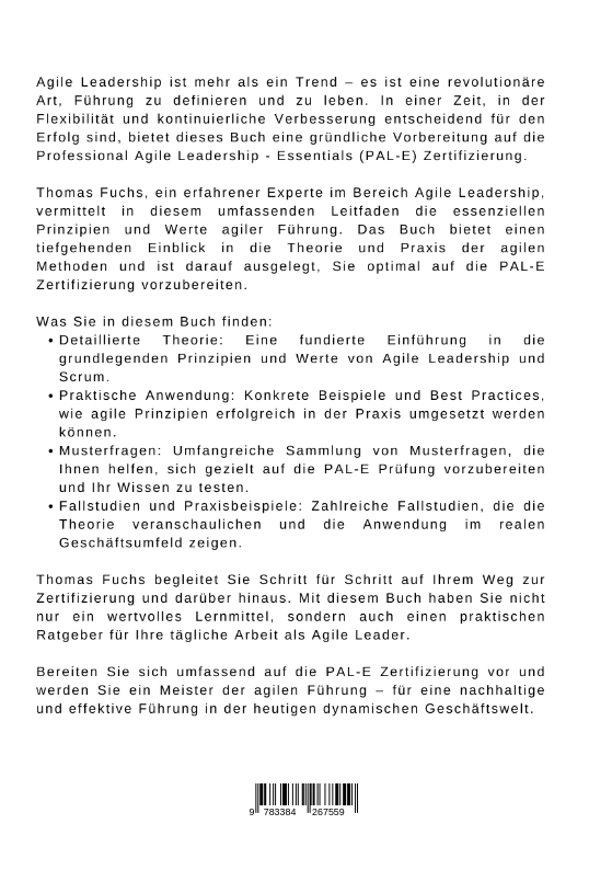 Agile Leadership ist mehr als ein Trend - es ist eine revolutionäre Art, Führung zu definieren und zu leben. In einer Zeit, in der Flexibilität und kontinuierliche Verbesserung entscheidend für den Erfolg sind, bietet dieses Buch eine gründliche Vorbereitung auf die Professional Agile Leadership - Essentials (PAL-E) Zertifizierung.Thomas Fuchs, ein erfahrener Experte im Bereich Agile Leadership, vermittelt in diesem umfassenden Leitfaden die essenziellen Prinzipien und Werte agiler Führung. Das Buch bietet einen tiefgehenden Einblick in die Theorie und Praxis der agilen Methoden und ist darauf ausgelegt, Sie optimal auf die PAL-E Zertifizierung vorzubereiten.Was Sie in diesem Buch finden:- Detaillierte Theorie: Eine fundierte Einführung in die grundlegenden Prinzipien und Werte von Agile Leadership und Scrum.- Praktische Anwendung: Konkrete Beispiele und Best Practices, wie agile Prinzipien erfolgreich in der Praxis umgesetzt werden können.- Musterfragen: Umfangreiche Sammlung von Musterfragen, die Ihnen helfen, sich gezielt auf die PAL-E Prüfung vorzubereiten und Ihr Wissen zu testen.- Fallstudien und Praxisbeispiele: Zahlreiche Fallstudien, die die Theorie veranschaulichen und die Anwendung im realen Geschäftsumfeld zeigen.Thomas Fuchs begleitet Sie Schritt für Schritt auf Ihrem Weg zur Zertifizierung und darüber hinaus. Mit diesem Buch haben Sie nicht nur ein wertvolles Lernmittel, sondern auch einen praktischen Ratgeber für Ihre tägliche Arbeit als Agile Leader.Bereiten Sie sich umfassend auf die PAL-E Zertifizierung vor und werden Sie ein Meister der agilen Führung - für eine nachhaltige und effektive Führung in der heutigen dynamischen Geschäftswelt.