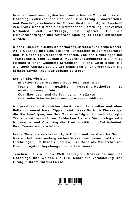 In einer zunehmend agilen Welt sind effektive Moderations- und Coaching-Techniken der Schlüssel zum Erfolg. "Moderations- und Coaching-Techniken für Scrum Master und Agile Coaches" von Frank Chen bietet eine umfassende Sammlung innovativer Methoden und Werkzeuge, die speziell für die Herausforderungen und Anforderungen agiler Teams entwickelt wurden.Dieses Buch ist ein unverzichtbarer Leitfaden für Scrum Master, Agile Coaches und alle, die ihre Fähigkeiten in der Moderation und im Coaching verbessern möchten. Von den Grundlagen der Teamdynamik über bewährte Moderationstechniken bis hin zu fortschrittlichen Coaching-Strategien - Frank Chen deckt alle wichtigen Aspekte ab, die zur Schaffung einer produktiven und kollaborativen Arbeitsumgebung beitragen.Lernen Sie, wie Sie:- Effektive Scrum-Meetings moderieren und leiten- Teams durch gezielte Coaching-Methoden zu Höchstleistungen führen- Konflikte lösen und die Teamdynamik stärken- Kontinuierliche Verbesserungsprozesse etablierenMit praxisnahen Beispielen, detaillierten Fallstudien und einer Fülle von umsetzbaren Tipps bietet dieses Buch die Werkzeuge, die Sie benötigen, um Ihre Teams erfolgreich durch die agile Transformation zu führen. Entdecken Sie, wie Sie durch gezielte Moderation und Coaching die Produktivität und Zufriedenheit Ihrer Teams steigern können.Frank Chen, ein erfahrener Agile Coach und zertifizierter Scrum Master, teilt sein umfangreiches Wissen und seine praktischen Erfahrungen, um Ihnen zu helfen, Ihre Rolle als Moderator und Coach in agilen Umgebungen zu perfektionieren.Tauchen Sie ein in die Welt der agilen Moderation und des Coachings und werden Sie zum Motor für Veränderung und Erfolg in Ihrem Unternehmen!