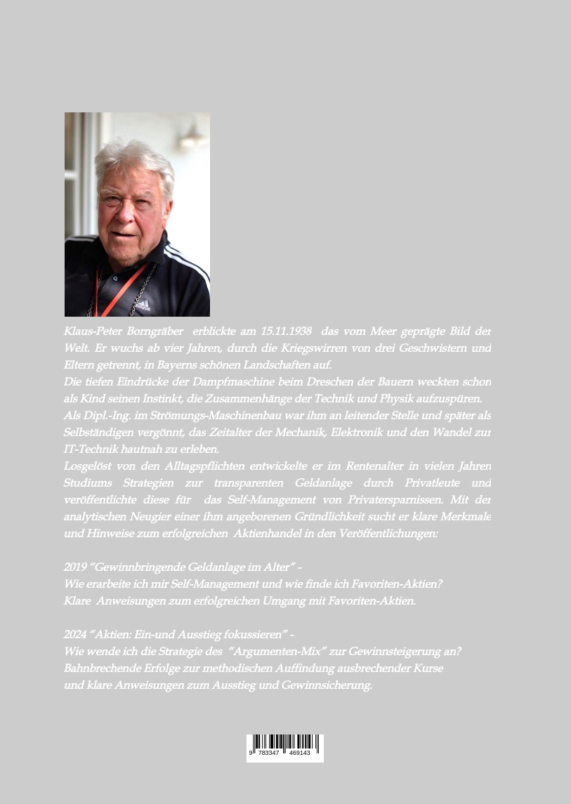 Klaus-Peter Borngräber erblickte am 15.11.1938 in Kiel das vom Meer geprägte Bild der Welt. Er wuchs ab 4 Jahren, durch die Kriegswirren von 3 Geschwistern und Eltern getrennt, in Bayerns Landschaften auf. Die tiefen Eindrücke der Dampfmaschine beim Dreschen der Bauern weckten schon als Kind seinen Instinkt, die Zusammenhänge der Technik und Physik aufzuspüren. Als Dipl.-Ing. im Strömungs-Maschinenbau war ihm an leitender Stelle und später als Selbständigen vergönnt, das Zeitalter der Mechanik, Elektronik und den Wandel zur IT-Technik hautnah zu erleben. Losgelöst von den Alltagspflichten entwickelte er im Rentenalter Strategien zur transparenten Geldanlage: - Wo & wie lege ich meine Ersparnisse erfolgreich an ? - Wie finde ich Anlage- & Dividenden-Favoriten ? - Welches Papier kaufe & verkaufe ich wann ? - Wie konstruiere ich ein risikoarmes Depot & wie ordere ich ?