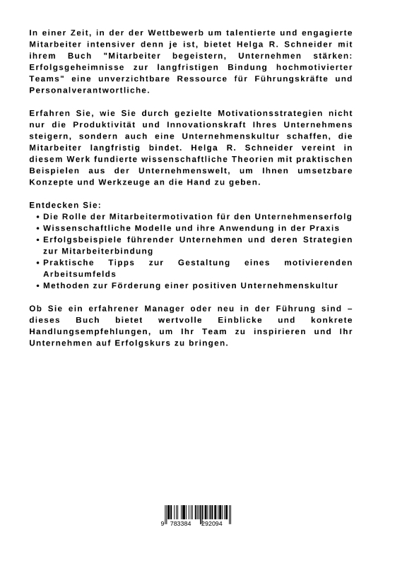 In einer Zeit, in der der Wettbewerb um talentierte und engagierte Mitarbeiter intensiver denn je ist, bietet Helga R. Schneider mit ihrem Buch "Mitarbeiter begeistern, Unternehmen stärken: Erfolgsgeheimnisse zur langfristigen Bindung hochmotivierter Teams" eine unverzichtbare Ressource für Führungskräfte und Personalverantwortliche.Erfahren Sie, wie Sie durch gezielte Motivationsstrategien nicht nur die Produktivität und Innovationskraft Ihres Unternehmens steigern, sondern auch eine Unternehmenskultur schaffen, die Mitarbeiter langfristig bindet. Helga R. Schneider vereint in diesem Werk fundierte wissenschaftliche Theorien mit praktischen Beispielen aus der Unternehmenswelt, um Ihnen umsetzbare Konzepte und Werkzeuge an die Hand zu geben.Entdecken Sie:Die Rolle der Mitarbeitermotivation für den UnternehmenserfolgWissenschaftliche Modelle und ihre Anwendung in der PraxisErfolgsbeispiele führender Unternehmen und deren Strategien zur MitarbeiterbindungPraktische Tipps zur Gestaltung eines motivierenden ArbeitsumfeldsMethoden zur Förderung einer positiven UnternehmenskulturOb Sie ein erfahrener Manager oder neu in der Führung sind - dieses Buch bietet wertvolle Einblicke und konkrete Handlungsempfehlungen, um Ihr Team zu inspirieren und Ihr Unternehmen auf Erfolgskurs zu bringen.