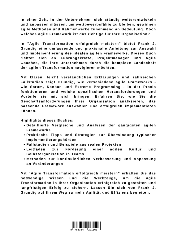 In "Agile Transformation erfolgreich meistern" bietet Frank J. Grundig eine umfassende und praxisnahe Anleitung zur Auswahl und Implementierung des idealen agilen Frameworks. Dieses Buch richtet sich an Führungskräfte, Projektmanager und Agile Coaches, die ihre Unternehmen durch die komplexe Landschaft der agilen Transformation navigieren möchten.