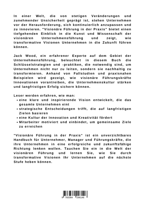 In einer Welt, die von stetigen Veränderungen und zunehmender Unsicherheit geprägt ist, stehen Unternehmen vor der Herausforderung, sich kontinuierlich anzupassen und zu innovieren. "Visionäre Führung in der Praxis" bietet einen tiefgehenden Einblick in die Kunst und Wissenschaft der visionären Unternehmensführung und zeigt, wie transformative Visionen Unternehmen in die Zukunft führen können.Jack Wood, ein erfahrener Experte auf dem Gebiet der Unternehmensführung, beleuchtet in diesem Buch die Schlüsselstrategien und -praktiken, die notwendig sind, um Unternehmen nicht nur zu leiten, sondern sie nachhaltig zu transformieren. Anhand von Fallstudien und praxisnahen Beispielen wird gezeigt, wie visionäre Führungskräfte Innovationen vorantreiben, die Unternehmenskultur stärken und langfristigen Erfolg sichern können.Leser werden erfahren, wie man:eine klare und inspirierende Vision entwickelt, die das gesamte Unternehmen eintstrategische Entscheidungen trifft, die auf langfristigen Zielen basiereneine Kultur der Innovation und Kreativität fördertMitarbeiter motiviert und einbindet, um gemeinsame Ziele zu erreichen"Visionäre Führung in der Praxis" ist ein unverzichtbares Handbuch für Unternehmer, Manager und Führungskräfte, die ihre Unternehmen in eine erfolgreiche und zukunftsfähige Richtung lenken wollen. Tauchen Sie ein in die Welt der visionären Führung und lernen Sie, wie Sie durch transformative Visionen Ihr Unternehmen auf die nächste Stufe heben können.