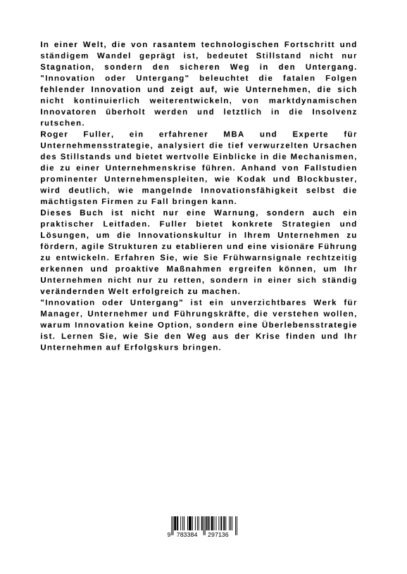 In einer Welt, die von rasantem technologischen Fortschritt und ständigem Wandel geprägt ist, bedeutet Stillstand nicht nur Stagnation, sondern den sicheren Weg in den Untergang. "Innovation oder Untergang" beleuchtet die fatalen Folgen fehlender Innovation und zeigt auf, wie Unternehmen, die sich nicht kontinuierlich weiterentwickeln, von marktdynamischen Innovatoren überholt werden und letztlich in die Insolvenz rutschen.Roger Fuller, ein erfahrener MBA und Experte für Unternehmensstrategie, analysiert die tief verwurzelten Ursachen des Stillstands und bietet wertvolle Einblicke in die Mechanismen, die zu einer Unternehmenskrise führen. Anhand von Fallstudien prominenter Unternehmenspleiten, wie Kodak und Blockbuster, wird deutlich, wie mangelnde Innovationsfähigkeit selbst die mächtigsten Firmen zu Fall bringen kann.Dieses Buch ist nicht nur eine Warnung, sondern auch ein praktischer Leitfaden. Fuller bietet konkrete Strategien und Lösungen, um die Innovationskultur in Ihrem Unternehmen zu fördern, agile Strukturen zu etablieren und eine visionäre Führung zu entwickeln. Erfahren Sie, wie Sie Frühwarnsignale rechtzeitig erkennen und proaktive Maßnahmen ergreifen können, um Ihr Unternehmen nicht nur zu retten, sondern in einer sich ständig verändernden Welt erfolgreich zu machen."Innovation oder Untergang" ist ein unverzichtbares Werk für Manager, Unternehmer und Führungskräfte, die verstehen wollen, warum Innovation keine Option, sondern eine Überlebensstrategie ist. Lernen Sie, wie Sie den Weg aus der Krise finden und Ihr Unternehmen auf Erfolgskurs bringen.