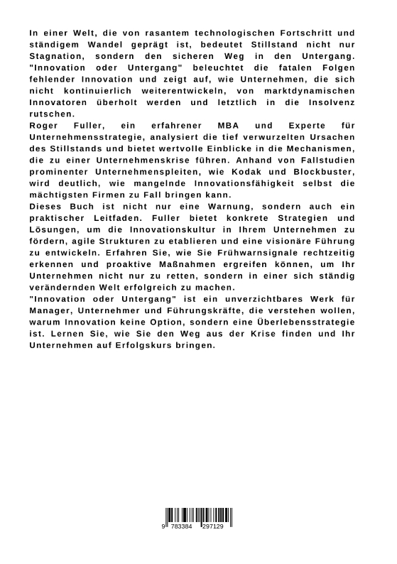 In einer Welt, die von rasantem technologischen Fortschritt und ständigem Wandel geprägt ist, bedeutet Stillstand nicht nur Stagnation, sondern den sicheren Weg in den Untergang. "Innovation oder Untergang" beleuchtet die fatalen Folgen fehlender Innovation und zeigt auf, wie Unternehmen, die sich nicht kontinuierlich weiterentwickeln, von marktdynamischen Innovatoren überholt werden und letztlich in die Insolvenz rutschen.Roger Fuller, ein erfahrener MBA und Experte für Unternehmensstrategie, analysiert die tief verwurzelten Ursachen des Stillstands und bietet wertvolle Einblicke in die Mechanismen, die zu einer Unternehmenskrise führen. Anhand von Fallstudien prominenter Unternehmenspleiten, wie Kodak und Blockbuster, wird deutlich, wie mangelnde Innovationsfähigkeit selbst die mächtigsten Firmen zu Fall bringen kann.Dieses Buch ist nicht nur eine Warnung, sondern auch ein praktischer Leitfaden. Fuller bietet konkrete Strategien und Lösungen, um die Innovationskultur in Ihrem Unternehmen zu fördern, agile Strukturen zu etablieren und eine visionäre Führung zu entwickeln. Erfahren Sie, wie Sie Frühwarnsignale rechtzeitig erkennen und proaktive Maßnahmen ergreifen können, um Ihr Unternehmen nicht nur zu retten, sondern in einer sich ständig verändernden Welt erfolgreich zu machen."Innovation oder Untergang" ist ein unverzichtbares Werk für Manager, Unternehmer und Führungskräfte, die verstehen wollen, warum Innovation keine Option, sondern eine Überlebensstrategie ist. Lernen Sie, wie Sie den Weg aus der Krise finden und Ihr Unternehmen auf Erfolgskurs bringen.