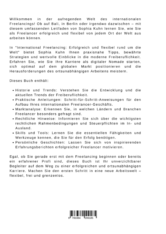 Willkommen in der aufregenden Welt des internationalen Freelancings! Ob auf Bali, in Berlin oder irgendwo dazwischen - mit diesem umfassenden Leitfaden von Sophia Kuhn lernen Sie, wie Sie als Freelancer erfolgreich und flexibel von jedem Ort der Welt aus arbeiten können.In "International Freelancing: Erfolgreich und flexibel rund um die Welt" bietet Sophia Kuhn Ihnen praxisnahe Tipps, bewährte Strategien und wertvolle Einblicke in die moderne Freiberuflichkeit. Erfahren Sie, wie Sie Ihre Karriere als digitaler Nomade starten, sich optimal auf dem globalen Markt positionieren und die Herausforderungen des ortsunabhängigen Arbeitens meistern.Dieses Buch enthält:Historie und Trends: Verstehen Sie die Entwicklung und die aktuellen Trends der Freiberuflichkeit.Praktische Anleitungen: Schritt-für-Schritt-Anweisungen für den Aufbau Ihres internationalen Freelancer-Geschäfts.Marktanalyse: Erkennen Sie, in welchen Ländern und Branchen Freelancer besonders gefragt sind.Rechtliche Hinweise: Informieren Sie sich über die wichtigsten rechtlichen Rahmenbedingungen und Steuerpflichten im In- und Ausland.Skills und Tools: Lernen Sie die essentiellen Fähigkeiten und Werkzeuge kennen, die Sie für den Erfolg benötigen.Persönliche Geschichten: Lassen Sie sich von inspirierenden Erfahrungsberichten erfolgreicher Freelancer motivieren.Egal, ob Sie gerade erst mit dem Freelancing beginnen oder bereits ein erfahrener Profi sind, dieses Buch ist Ihr unverzichtbarer Begleiter auf dem Weg zu einer erfolgreichen und ortsunabhängigen Karriere. Machen Sie den ersten Schritt in eine neue Arbeitswelt - flexibel, frei und grenzenlos.