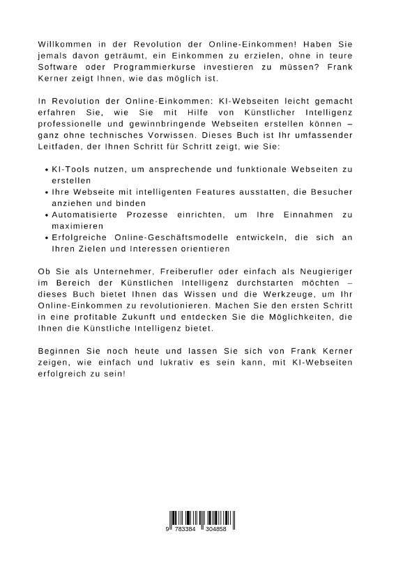 Willkommen in der Revolution der Online-Einkommen! Haben Sie jemals davon geträumt, ein Einkommen zu erzielen, ohne in teure Software oder Programmierkurse investieren zu müssen? Frank Kerner zeigt Ihnen, wie das möglich ist.In Revolution der Online-Einkommen: KI-Webseiten leicht gemacht erfahren Sie, wie Sie mit Hilfe von Künstlicher Intelligenz professionelle und gewinnbringende Webseiten erstellen können - ganz ohne technisches Vorwissen. Dieses Buch ist Ihr umfassender Leitfaden, der Ihnen Schritt für Schritt zeigt, wie Sie:KI-Tools nutzen, um ansprechende und funktionale Webseiten zu erstellenIhre Webseite mit intelligenten Features ausstatten, die Besucher anziehen und bindenAutomatisierte Prozesse einrichten, um Ihre Einnahmen zu maximierenErfolgreiche Online-Geschäftsmodelle entwickeln, die sich an Ihren Zielen und Interessen orientierenOb Sie als Unternehmer, Freiberufler oder einfach als Neugieriger im Bereich der Künstlichen Intelligenz durchstarten möchten - dieses Buch bietet Ihnen das Wissen und die Werkzeuge, um Ihr Online-Einkommen zu revolutionieren. Machen Sie den ersten Schritt in eine profitable Zukunft und entdecken Sie die Möglichkeiten, die Ihnen die Künstliche Intelligenz bietet.Beginnen Sie noch heute und lassen Sie sich von Frank Kerner zeigen, wie einfach und lukrativ es sein kann, mit KI-Webseiten erfolgreich zu sein!