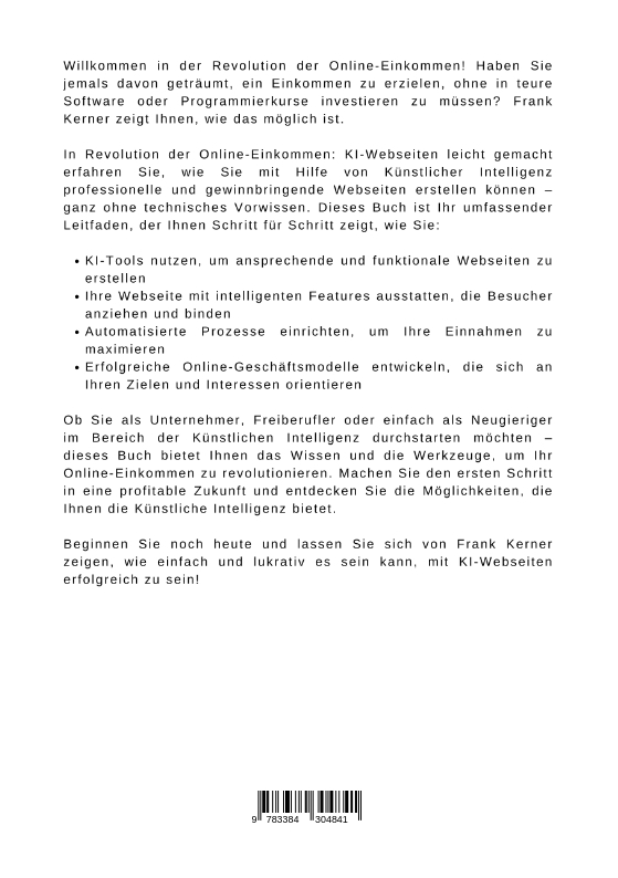 Willkommen in der Revolution der Online-Einkommen! Haben Sie jemals davon geträumt, ein Einkommen zu erzielen, ohne in teure Software oder Programmierkurse investieren zu müssen? Frank Kerner zeigt Ihnen, wie das möglich ist.In Revolution der Online-Einkommen: KI-Webseiten leicht gemacht erfahren Sie, wie Sie mit Hilfe von Künstlicher Intelligenz professionelle und gewinnbringende Webseiten erstellen können - ganz ohne technisches Vorwissen. Dieses Buch ist Ihr umfassender Leitfaden, der Ihnen Schritt für Schritt zeigt, wie Sie:KI-Tools nutzen, um ansprechende und funktionale Webseiten zu erstellenIhre Webseite mit intelligenten Features ausstatten, die Besucher anziehen und bindenAutomatisierte Prozesse einrichten, um Ihre Einnahmen zu maximierenErfolgreiche Online-Geschäftsmodelle entwickeln, die sich an Ihren Zielen und Interessen orientierenOb Sie als Unternehmer, Freiberufler oder einfach als Neugieriger im Bereich der Künstlichen Intelligenz durchstarten möchten - dieses Buch bietet Ihnen das Wissen und die Werkzeuge, um Ihr Online-Einkommen zu revolutionieren. Machen Sie den ersten Schritt in eine profitable Zukunft und entdecken Sie die Möglichkeiten, die Ihnen die Künstliche Intelligenz bietet.Beginnen Sie noch heute und lassen Sie sich von Frank Kerner zeigen, wie einfach und lukrativ es sein kann, mit KI-Webseiten erfolgreich zu sein!