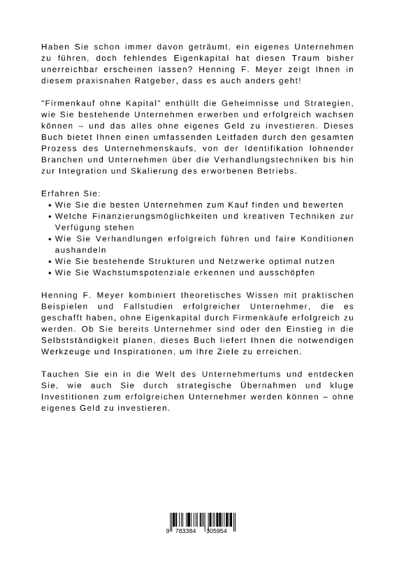 Haben Sie schon immer davon geträumt, ein eigenes Unternehmen zu führen, doch fehlendes Eigenkapital hat diesen Traum bisher unerreichbar erscheinen lassen? Henning F. Meyer zeigt Ihnen in diesem praxisnahen Ratgeber, dass es auch anders geht!"Firmenkauf ohne Kapital" enthüllt die Geheimnisse und Strategien, wie Sie bestehende Unternehmen erwerben und erfolgreich wachsen können - und das alles ohne eigenes Geld zu investieren. Dieses Buch bietet Ihnen einen umfassenden Leitfaden durch den gesamten Prozess des Unternehmenskaufs, von der Identifikation lohnender Branchen und Unternehmen über die Verhandlungstechniken bis hin zur Integration und Skalierung des erworbenen Betriebs.Erfahren Sie:Wie Sie die besten Unternehmen zum Kauf finden und bewertenWelche Finanzierungsmöglichkeiten und kreativen Techniken zur Verfügung stehenWie Sie Verhandlungen erfolgreich führen und faire Konditionen aushandelnWie Sie bestehende Strukturen und Netzwerke optimal nutzenWie Sie Wachstumspotenziale erkennen und ausschöpfenHenning F. Meyer kombiniert theoretisches Wissen mit praktischen Beispielen und Fallstudien erfolgreicher Unternehmer, die es geschafft haben, ohne Eigenkapital durch Firmenkäufe erfolgreich zu werden. Ob Sie bereits Unternehmer sind oder den Einstieg in die Selbstständigkeit planen, dieses Buch liefert Ihnen die notwendigen Werkzeuge und Inspirationen, um Ihre Ziele zu erreichen.Tauchen Sie ein in die Welt des Unternehmertums und entdecken Sie, wie auch Sie durch strategische Übernahmen und kluge Investitionen zum erfolgreichen Unternehmer werden können - ohne eigenes Geld zu investieren.