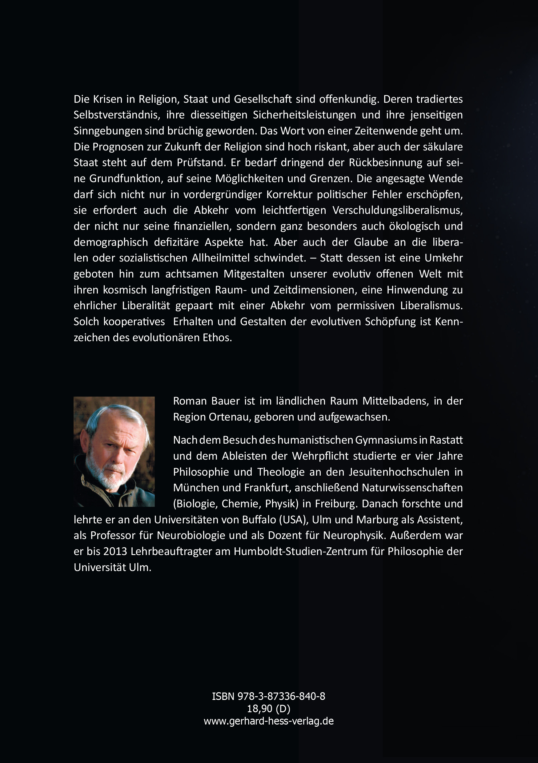 Die Krisen in Religion, Staat und Gesellschaft sind offenkundig. Deren tradiertes Selbstverständnis, ihre diesseitigen Sicherheitsleistungen und ihre jenseitigen Sinngebungen sind brüchig geworden. Das Wort von einer Zeitenwende geht um. Die Prognosen zur Zukunft der Religion sind hoch riskant, aber auch der säkulare Staat steht auf dem Prüfstand. Er bedarf dringend der Rückbesinnung auf seine Grundfunktion, auf seine Möglichkeiten und Grenzen. Die angesagte Wende darf sich nicht nur in vordergründiger Korrektur politischer Fehler erschöpfen, sie erfordert auch die Abkehr vom leichtfertigen Verschuldungsliberalismus, der nicht nur seine finanziellen, sondern ganz besonders auch ökologisch und demographisch defizitäre Aspekte hat. Aber auch der Glaube an die liberalen oder sozialistischen Allheilmittel schwindet. - Statt dessen ist eine Umkehr geboten hin zum achtsamen Mitgestalten unserer evolutiv offenen Welt mit ihren kosmisch langfristigen Raum- und Zeit dimensionen, eine Hinwendung zu ehrlicher Liberalität gepaart mit einer Abkehr vom permissiven Liberalismus. Solch kooperatives Erhalten und Gestalten der evolutiven Schöpfung ist Kennzeichen des evolutionären Ethos.