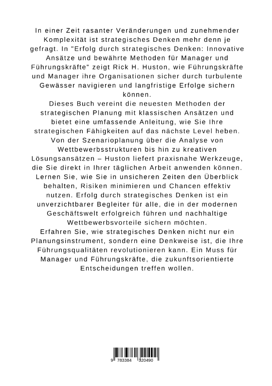 In einer Zeit rasanter Veränderungen und zunehmender Komplexität ist strategisches Denken mehr denn je gefragt. In "Erfolg durch strategisches Denken: Innovative Ansätze und bewährte Methoden für Manager und Führungskräfte" zeigt Rick H. Huston, wie Führungskräfte und Manager ihre Organisationen sicher durch turbulente Gewässer navigieren und langfristige Erfolge sichern können.Dieses Buch vereint die neuesten Methoden der strategischen Planung mit klassischen Ansätzen und bietet eine umfassende Anleitung, wie Sie Ihre strategischen Fähigkeiten auf das nächste Level heben. Von der Szenarioplanung über die Analyse von Wettbewerbsstrukturen bis hin zu kreativen Lösungsansätzen - Huston liefert praxisnahe Werkzeuge, die Sie direkt in Ihrer täglichen Arbeit anwenden können.Lernen Sie, wie Sie in unsicheren Zeiten den Überblick behalten, Risiken minimieren und Chancen effektiv nutzen. Erfolg durch strategisches Denken ist ein unverzichtbarer Begleiter für alle, die in der modernen Geschäftswelt erfolgreich führen und nachhaltige Wettbewerbsvorteile sichern möchten.Erfahren Sie, wie strategisches Denken nicht nur ein Planungsinstrument, sondern eine Denkweise ist, die Ihre Führungsqualitäten revolutionieren kann. Ein Muss für Manager und Führungskräfte, die zukunftsorientierte Entscheidungen treffen wollen.