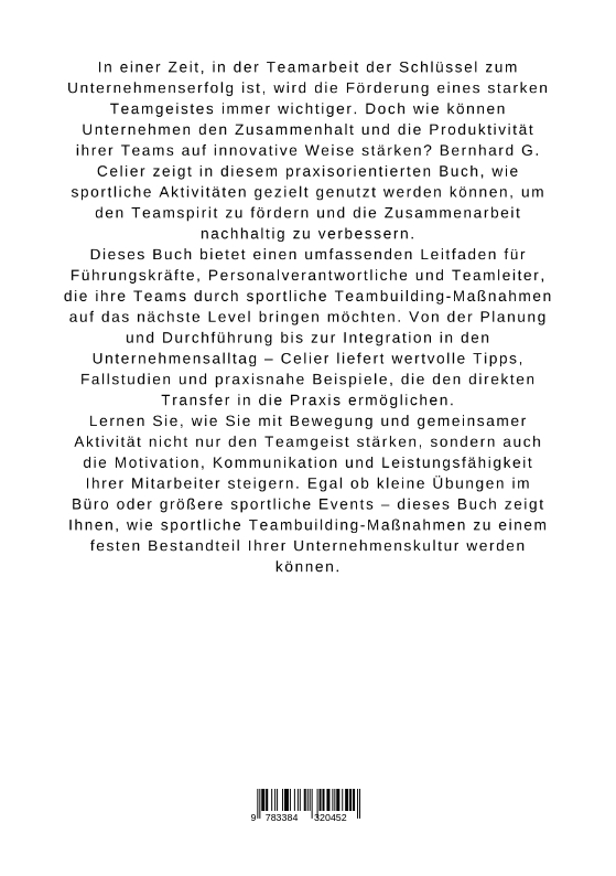 In einer Zeit, in der Teamarbeit der Schlüssel zum Unternehmenserfolg ist, wird die Förderung eines starken Teamgeistes immer wichtiger. Doch wie können Unternehmen den Zusammenhalt und die Produktivität ihrer Teams auf innovative Weise stärken? Bernhard G. Celier zeigt in diesem praxisorientierten Buch, wie sportliche Aktivitäten gezielt genutzt werden können, um den Teamspirit zu fördern und die Zusammenarbeit nachhaltig zu verbessern.Dieses Buch bietet einen umfassenden Leitfaden für Führungskräfte, Personalverantwortliche und Teamleiter, die ihre Teams durch sportliche Teambuilding-Maßnahmen auf das nächste Level bringen möchten. Von der Planung und Durchführung bis zur Integration in den Unternehmensalltag - Celier liefert wertvolle Tipps, Fallstudien und praxisnahe Beispiele, die den direkten Transfer in die Praxis ermöglichen.Lernen Sie, wie Sie mit Bewegung und gemeinsamer Aktivität nicht nur den Teamgeist stärken, sondern auch die Motivation, Kommunikation und Leistungsfähigkeit Ihrer Mitarbeiter steigern. Egal ob kleine Übungen im Büro oder größere sportliche Events - dieses Buch zeigt Ihnen, wie sportliche Teambuilding-Maßnahmen zu einem festen Bestandteil Ihrer Unternehmenskultur werden können.