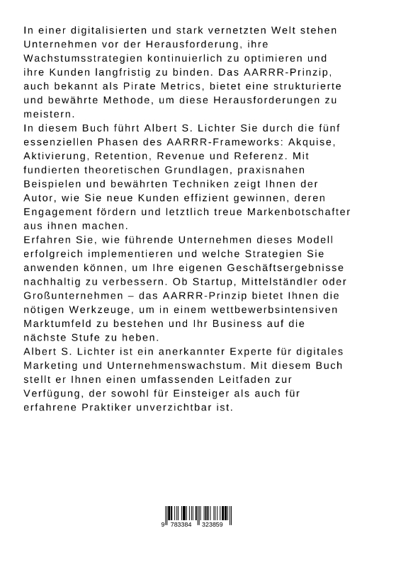 In einer digitalisierten und stark vernetzten Welt stehen Unternehmen vor der Herausforderung, ihre Wachstumsstrategien kontinuierlich zu optimieren und ihre Kunden langfristig zu binden. Das AARRR-Prinzip, auch bekannt als Pirate Metrics, bietet eine strukturierte und bewährte Methode, um diese Herausforderungen zu meistern.In diesem Buch führt Albert S. Lichter Sie durch die fünf essenziellen Phasen des AARRR-Frameworks: Akquise, Aktivierung, Retention, Revenue und Referenz. Mit fundierten theoretischen Grundlagen, praxisnahen Beispielen und bewährten Techniken zeigt Ihnen der Autor, wie Sie neue Kunden effizient gewinnen, deren Engagement fördern und letztlich treue Markenbotschafter aus ihnen machen.Erfahren Sie, wie führende Unternehmen dieses Modell erfolgreich implementieren und welche Strategien Sie anwenden können, um Ihre eigenen Geschäftsergebnisse nachhaltig zu verbessern. Ob Startup, Mittelständler oder Großunternehmen - das AARRR-Prinzip bietet Ihnen die nötigen Werkzeuge, um in einem wettbewerbsintensiven Marktumfeld zu bestehen und Ihr Business auf die nächste Stufe zu heben.Albert S. Lichter ist ein anerkannter Experte für digitales Marketing und Unternehmenswachstum. Mit diesem Buch stellt er Ihnen einen umfassenden Leitfaden zur Verfügung, der sowohl für Einsteiger als auch für erfahrene Praktiker unverzichtbar ist.
