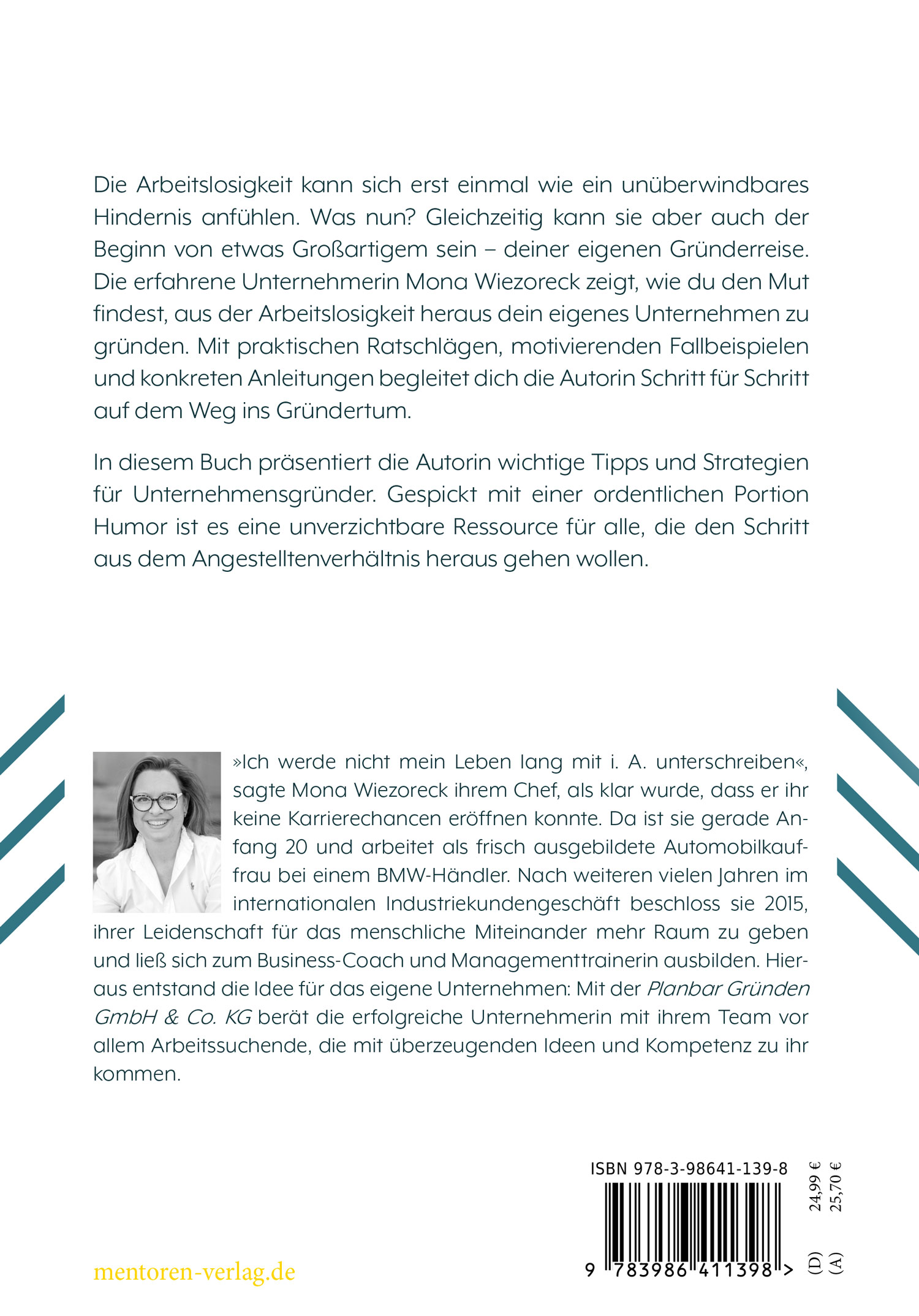 »Ich werde nicht mein Leben lang mit i. A. unterschreiben«, sagte Mona Wiezoreck ihrem Chef, als klar wurde, dass er ihr keine Karrierechancen eröffnen konnte. Da ist sie gerade Anfang 20 und arbeitet als frisch ausgebildete Automobilkauffrau bei einem BMW-Händler. Nach weiteren vielen Jahren im internationalen Industriekundengeschäft beschloss sie 2015, ihrer Leidenschaft für das menschliche Miteinander mehr Raum zu geben und ließ sich zum Business-Coach und Managementtrainerin ausbilden. Hieraus entstand die Idee für das eigene Unternehmen: Mit der Planbar Gründen GmbH & Co. KG berät die erfolgreiche Unternehmerin mit ihrem Team vor allem Arbeitssuchende, die mit überzeugenden Ideen und Kompetenz zu ihr kommen.