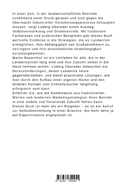 In einer Zeit, in der landwirtschaftliche Betriebe zunehmend unter Druck geraten und sich gegen die Übermacht industrieller Verarbeitungsprozesse behaupten müssen, zeigt Ludwig Obereder einen Ausweg: Selbstvermarktung und Direktvertrieb. Mit fundiertem Fachwissen und praktischen Beispielen gibt dieses Buch wertvolle Einblicke in die Strategien, die es Landwirten ermöglichen, ihre Abhängigkeit von Großabnehmern zu verringern und ihre wirtschaftliche Unabhängigkeit zurückzugewinnen.Marke Bauernhof ist ein Leitfaden für alle, die in der Landwirtschaft tätig sind und ihre Zukunft selbst in die Hand nehmen wollen. Ludwig Obereder beleuchtet die Herausforderungen, denen Landwirte heute gegenüberstehen, und bietet praxisnahe Lösungen, wie man durch den Aufbau einer eigenen Marke und den direkten Kontakt zum Endverbraucher langfristig erfolgreich sein kann.Erfahren Sie, wie die Kombination aus traditionellen Werten und modernen Marketingstrategien Ihren Betrieb in eine stabile und florierende Zukunft führen kann. Dieses Buch ist mehr als ein Ratgeber - es ist ein Aufruf zur Selbstbestimmung in einer Branche, die mehr denn je auf Eigeninitiative angewiesen ist.