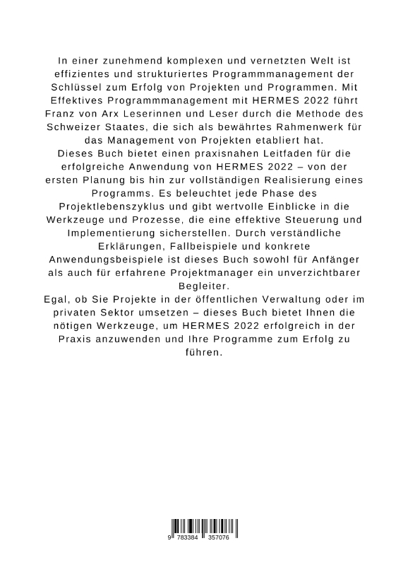 In einer zunehmend komplexen und vernetzten Welt ist effizientes und strukturiertes Programmmanagement der Schlüssel zum Erfolg von Projekten und Programmen. Mit Effektives Programmmanagement mit HERMES 2022 führt Franz von Arx Leserinnen und Leser durch die Methode des Schweizer Staates, die sich als bewährtes Rahmenwerk für das Management von Projekten etabliert hat.Dieses Buch bietet einen praxisnahen Leitfaden für die erfolgreiche Anwendung von HERMES 2022 - von der ersten Planung bis hin zur vollständigen Realisierung eines Programms. Es beleuchtet jede Phase des Projektlebenszyklus und gibt wertvolle Einblicke in die Werkzeuge und Prozesse, die eine effektive Steuerung und Implementierung sicherstellen. Durch verständliche Erklärungen, Fallbeispiele und konkrete Anwendungsbeispiele ist dieses Buch sowohl für Anfänger als auch für erfahrene Projektmanager ein unverzichtbarer Begleiter.Egal, ob Sie Projekte in der öffentlichen Verwaltung oder im privaten Sektor umsetzen - dieses Buch bietet Ihnen die nötigen Werkzeuge, um HERMES 2022 erfolgreich in der Praxis anzuwenden und Ihre Programme zum Erfolg zu führen.