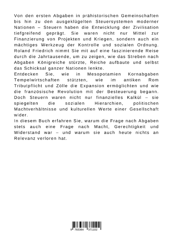 Von den ersten Abgaben in prähistorischen Gemeinschaften bis hin zu den ausgeklügelten Steuersystemen moderner Nationen - Steuern haben die Entwicklung der Zivilisation tiefgreifend geprägt. Sie waren nicht nur Mittel zur Finanzierung von Projekten und Kriegen, sondern auch ein mächtiges Werkzeug der Kontrolle und sozialen Ordnung. Roland Friedrich nimmt Sie mit auf eine faszinierende Reise durch die Jahrtausende, um zu zeigen, wie das Streben nach Abgaben Königreiche stürzte, Reiche aufbaute und selbst das Schicksal ganzer Nationen lenkte.Entdecken Sie, wie in Mesopotamien Kornabgaben Tempelwirtschaften stützten, wie im antiken Rom Tributpflicht und Zölle die Expansion ermöglichten und wie die französische Revolution mit der Besteuerung begann. Doch Steuern waren nicht nur finanzielles Kalkül - sie spiegelten die sozialen Hierarchien, politischen Machtverhältnisse und kulturellen Werte einer Gesellschaft wider.In diesem Buch erfahren Sie, warum die Frage nach Abgaben stets auch eine Frage nach Macht, Gerechtigkeit und Widerstand war - und warum sie auch heute nichts an Relevanz verloren hat.