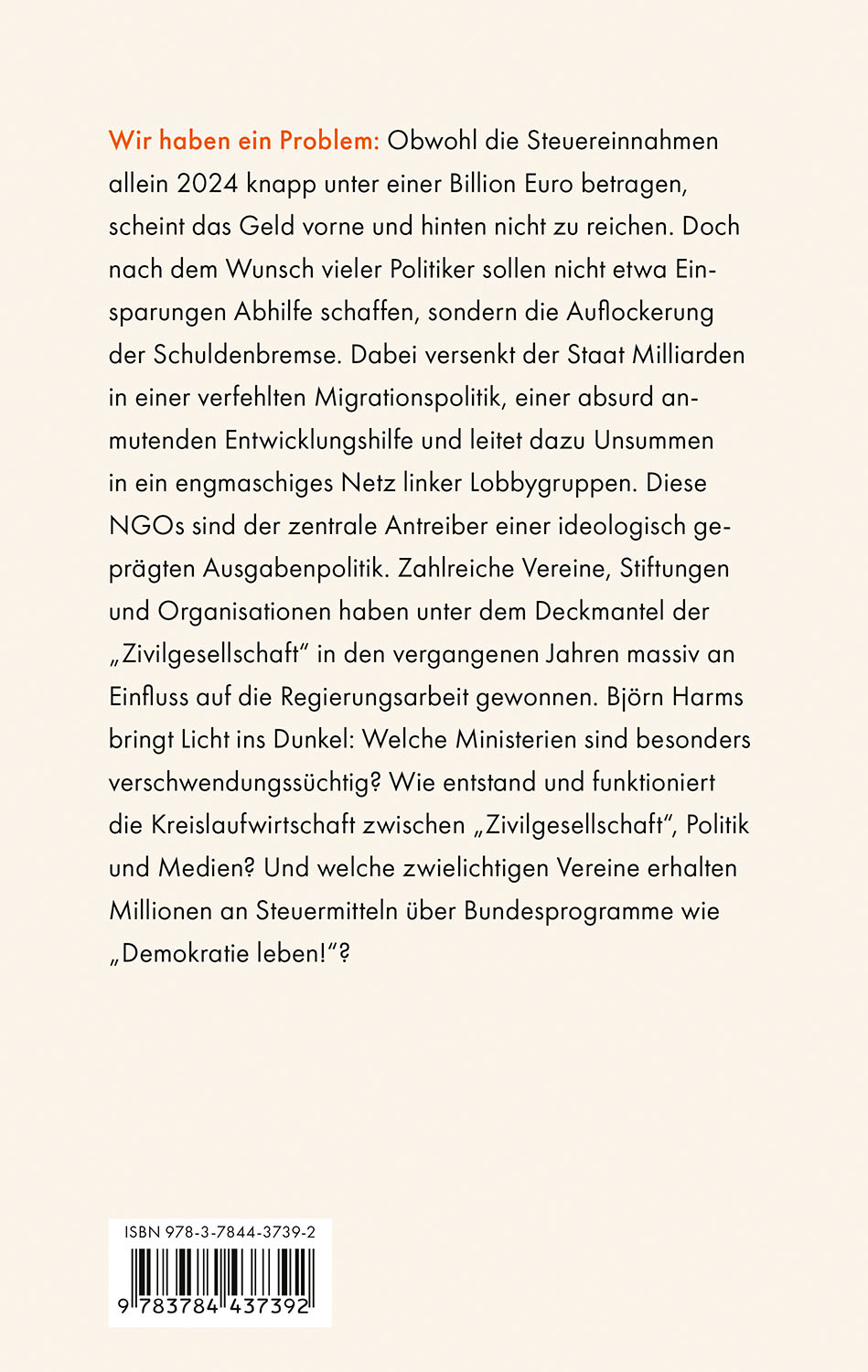 Wir haben ein Problem: Obwohl die Steuereinnahmen allein 2024 knapp unter eine Billion Euro betragen, reicht das Geld vorne und hinten nicht. Es drohen wahlweise Steuererhöhungen oder neue Schulden. Dabei versenkt der Staat Milliarden in einer verfehlten Migrationspolitik, einer absurd anmutenden Entwicklungshilfe und leitet Unsummen in ein engmaschiges Netz linker Lobbygruppen. Diese NGOs sind der zentrale Antreiber einer ideologisch geprägten Ausgabenpolitik. Zahlreiche Vereine, Stiftungen und Organisationen haben unter dem Deckmantel der „Zivilgesellschaft“ in den vergangenen Jahren massiv an Einfluss auf die Regierungsarbeit gewonnen. Björn Harms bringt Licht ins Dunkel: Welche Ministerien sind besonders verschwendungssüchtig? Wie entstand und funktioniert die Kreislaufwirtschaft zwischen „Zivilgesellschaft“, Politik und Medien? Und welche zwielichtigen Vereine erhalten Millionen an Steuermitteln über Bundesprogramme wie „Demokratie leben!"?