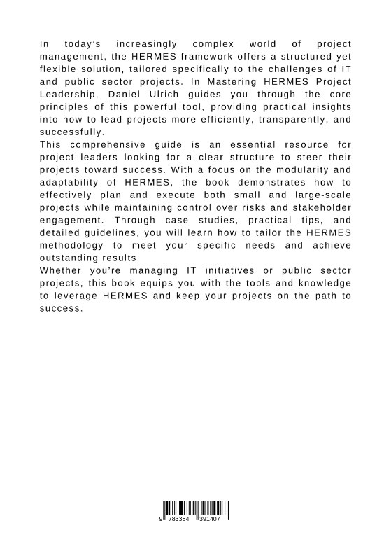 In today's increasingly complex world of project management, the HERMES framework offers a structured yet flexible solution, tailored specifically to the challenges of IT and public sector projects. In Mastering HERMES Project Leadership, Daniel Ulrich guides you through the core principles of this powerful tool, providing practical insights into how to lead projects more efficiently, transparently, and successfully.This comprehensive guide is an essential resource for project leaders looking for a clear structure to steer their projects toward success. With a focus on the modularity and adaptability of HERMES, the book demonstrates how to effectively plan and execute both small and large-scale projects while maintaining control over risks and stakeholder engagement. Through case studies, practical tips, and detailed guidelines, you will learn how to tailor the HERMES methodology to meet your specific needs and achieve outstanding results.Whether you're managing IT initiatives or public sector projects, this book equips you with the tools and knowledge to leverage HERMES and keep your projects on the path to success.