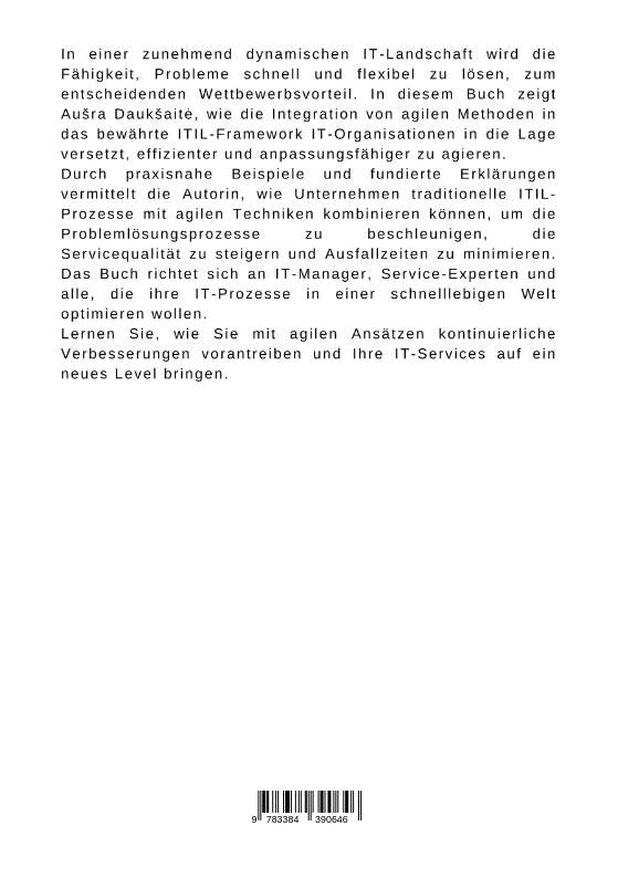 In einer zunehmend dynamischen IT-Landschaft wird die Fähigkeit, Probleme schnell und flexibel zu lösen, zum entscheidenden Wettbewerbsvorteil. In diesem Buch zeigt Ausra Dauksait , wie die Integration von agilen Methoden in das bewährte ITIL-Framework IT-Organisationen in die Lage versetzt, effizienter und anpassungsfähiger zu agieren.Durch praxisnahe Beispiele und fundierte Erklärungen vermittelt die Autorin, wie Unternehmen traditionelle ITIL-Prozesse mit agilen Techniken kombinieren können, um die Problemlösungsprozesse zu beschleunigen, die Servicequalität zu steigern und Ausfallzeiten zu minimieren. Das Buch richtet sich an IT-Manager, Service-Experten und alle, die ihre IT-Prozesse in einer schnelllebigen Welt optimieren wollen.Lernen Sie, wie Sie mit agilen Ansätzen kontinuierliche Verbesserungen vorantreiben und Ihre IT-Services auf ein neues Level bringen.