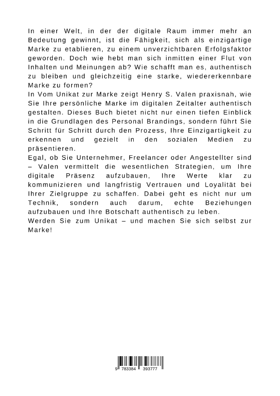 In einer Welt, in der der digitale Raum immer mehr an Bedeutung gewinnt, ist die Fähigkeit, sich als einzigartige Marke zu etablieren, zu einem unverzichtbaren Erfolgsfaktor geworden. Doch wie hebt man sich inmitten einer Flut von Inhalten und Meinungen ab? Wie schafft man es, authentisch zu bleiben und gleichzeitig eine starke, wiedererkennbare Marke zu formen?In Vom Unikat zur Marke zeigt Henry S. Valen praxisnah, wie Sie Ihre persönliche Marke im digitalen Zeitalter authentisch gestalten. Dieses Buch bietet nicht nur einen tiefen Einblick in die Grundlagen des Personal Brandings, sondern führt Sie Schritt für Schritt durch den Prozess, Ihre Einzigartigkeit zu erkennen und gezielt in den sozialen Medien zu präsentieren.Egal, ob Sie Unternehmer, Freelancer oder Angestellter sind - Valen vermittelt die wesentlichen Strategien, um Ihre digitale Präsenz aufzubauen, Ihre Werte klar zu kommunizieren und langfristig Vertrauen und Loyalität bei Ihrer Zielgruppe zu schaffen. Dabei geht es nicht nur um Technik, sondern auch darum, echte Beziehungen aufzubauen und Ihre Botschaft authentisch zu leben.