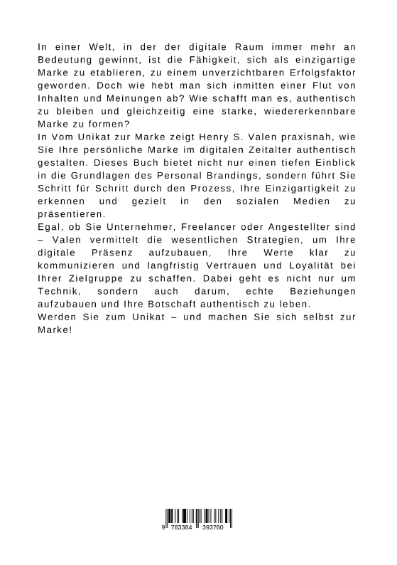 In einer Welt, in der der digitale Raum immer mehr an Bedeutung gewinnt, ist die Fähigkeit, sich als einzigartige Marke zu etablieren, zu einem unverzichtbaren Erfolgsfaktor geworden. Doch wie hebt man sich inmitten einer Flut von Inhalten und Meinungen ab? Wie schafft man es, authentisch zu bleiben und gleichzeitig eine starke, wiedererkennbare Marke zu formen?In Vom Unikat zur Marke zeigt Henry S. Valen praxisnah, wie Sie Ihre persönliche Marke im digitalen Zeitalter authentisch gestalten. Dieses Buch bietet nicht nur einen tiefen Einblick in die Grundlagen des Personal Brandings, sondern führt Sie Schritt für Schritt durch den Prozess, Ihre Einzigartigkeit zu erkennen und gezielt in den sozialen Medien zu präsentieren.Egal, ob Sie Unternehmer, Freelancer oder Angestellter sind - Valen vermittelt die wesentlichen Strategien, um Ihre digitale Präsenz aufzubauen, Ihre Werte klar zu kommunizieren und langfristig Vertrauen und Loyalität bei Ihrer Zielgruppe zu schaffen. Dabei geht es nicht nur um Technik, sondern auch darum, echte Beziehungen aufzubauen und Ihre Botschaft authentisch zu leben.