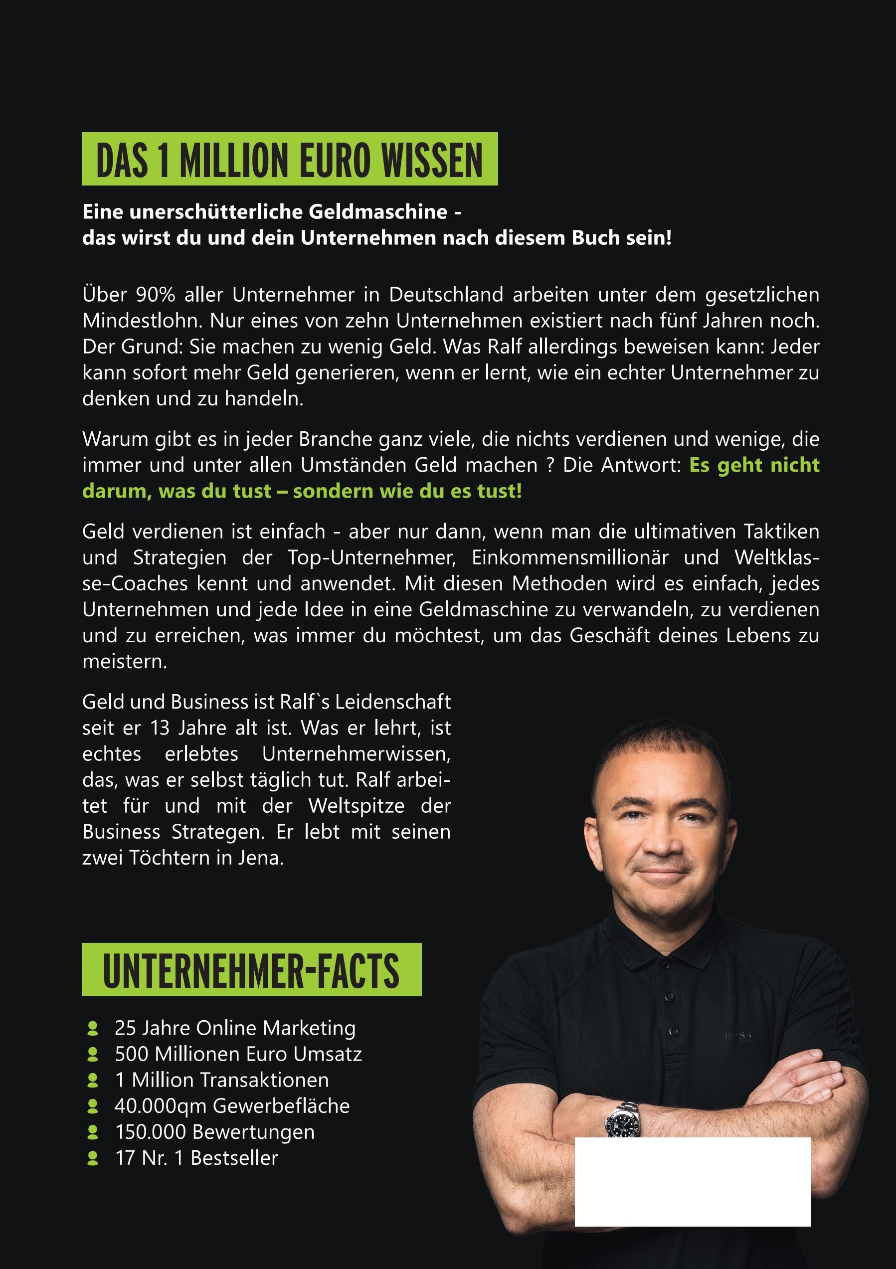 Was Ralf allerdings beweisen kann: Jeder kann sofort mehr Geld generieren, wenn er lernt, wie ein echter Unternehmer zu denken und zu handeln. Warum gibt es in jeder Branche ganz viele, die nichts verdienen und wenige, die immer und unter allen Umständen Geld machen? Die Antwort: Es geht nicht darum, was du tust - sondern wie du es tust! Geld verdienen ist einfach – aber nur dann, wenn man die ultimativen Taktiken und Strategien der Top-Unternehmer, Einkommensmillionär und Weltklassen-Coaches kennt und anwendet.
