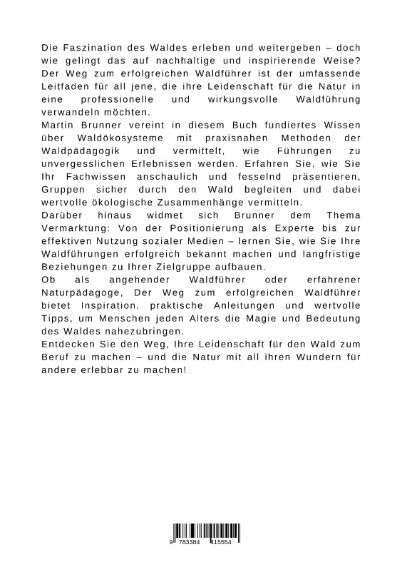 Die Faszination des Waldes erleben und weitergeben - doch wie gelingt das auf nachhaltige und inspirierende Weise? Der Weg zum erfolgreichen Waldführer ist der umfassende Leitfaden für all jene, die ihre Leidenschaft für die Natur in eine professionelle und wirkungsvolle Waldführung verwandeln möchten.Martin Brunner vereint in diesem Buch fundiertes Wissen über Waldökosysteme mit praxisnahen Methoden der Waldpädagogik und vermittelt, wie Führungen zu unvergesslichen Erlebnissen werden. Erfahren Sie, wie Sie Ihr Fachwissen anschaulich und fesselnd präsentieren, Gruppen sicher durch den Wald begleiten und dabei wertvolle ökologische Zusammenhänge vermitteln.Darüber hinaus widmet sich Brunner dem Thema Vermarktung: Von der Positionierung als Experte bis zur effektiven Nutzung sozialer Medien - lernen Sie, wie Sie Ihre Waldführungen erfolgreich bekannt machen und langfristige Beziehungen zu Ihrer Zielgruppe aufbauen.Ob als angehender Waldführer oder erfahrener Naturpädagoge, Der Weg zum erfolgreichen Waldführer bietet Inspiration, praktische Anleitungen und wertvolle Tipps, um Menschen jeden Alters die Magie und Bedeutung des Waldes nahezubringen.Entdecken Sie den Weg, Ihre Leidenschaft für den Wald zum Beruf zu machen - und die Natur mit all ihren Wundern für andere erlebbar zu machen!