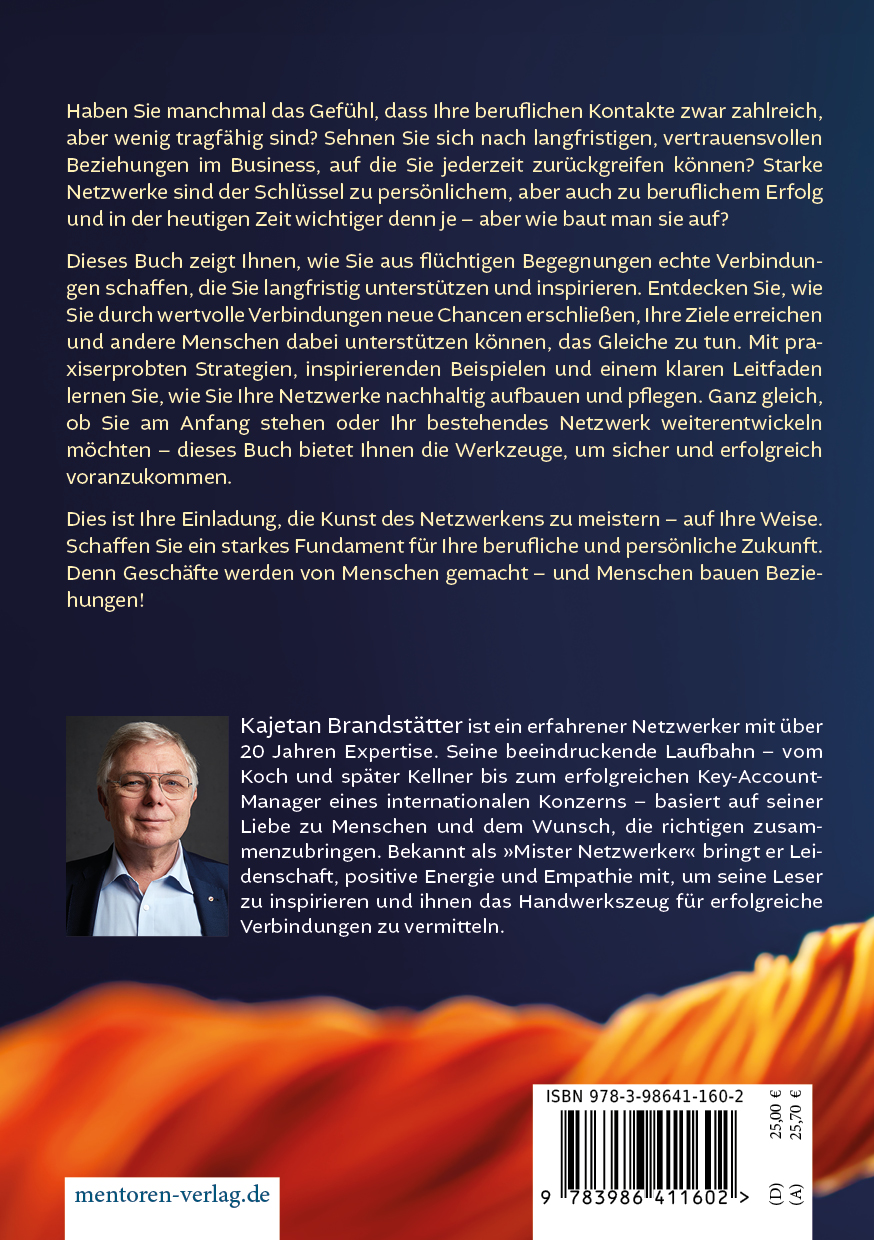 Dies ist Ihre Einladung, die Kunst des Netzwerkens zu meistern - auf Ihre Weise. Schaffen Sie ein starkes Fundament für Ihre berufliche und persönliche Zukunft. Denn Geschäfte werden von Menschen gemacht - und Menschen bauen Beziehungen!Kajetan Brandstätter ist ein erfahrener Netzwerker mit über 20 Jahren Expertise. Seine beeindruckende Laufbahn – vom Koch und später Kellner bis zum erfolgreichen Key-Account-Manager eines internationalen Konzerns – basiert auf seiner Liebe zu Menschen und dem Wunsch, die richtigen zusammenzubringen. Bekannt als »Mister Netzwerker« bringt er Leidenschaft, positive Energie und Empathie mit, um seine Leser zu inspirieren und ihnen das Handwerkszeug für erfolgreiche Verbindungen zu vermitteln.