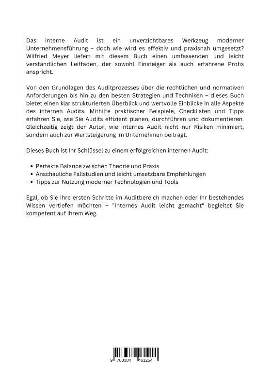 Das interne Audit ist ein unverzichtbares Werkzeug moderner Unternehmensführung - doch wie wird es effektiv und praxisnah umgesetzt? Wilfried Meyer liefert mit diesem Buch einen umfassenden und leicht verständlichen Leitfaden, der sowohl Einsteiger als auch erfahrene Profis anspricht.Von den Grundlagen des Auditprozesses über die rechtlichen und normativen Anforderungen bis hin zu den besten Strategien und Techniken - dieses Buch bietet einen klar strukturierten Überblick und wertvolle Einblicke in alle Aspekte des internen Audits. Mithilfe praktischer Beispiele, Checklisten und Tipps erfahren Sie, wie Sie Audits effizient planen, durchführen und dokumentieren. Gleichzeitig zeigt der Autor, wie internes Audit nicht nur Risiken minimiert, sondern auch zur Wertsteigerung im Unternehmen beiträgt.Dieses Buch ist Ihr Schlüssel zu einem erfolgreichen internen Audit:Perfekte Balance zwischen Theorie und PraxisAnschauliche Fallstudien und leicht umsetzbare EmpfehlungenTipps zur Nutzung moderner Technologien und ToolsEgal, ob Sie Ihre ersten Schritte im Auditbereich machen oder Ihr bestehendes Wissen vertiefen möchten - "Internes Audit leicht gemacht" begleitet Sie kompetent auf Ihrem Weg.
