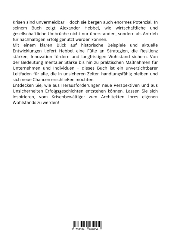 Krisen sind unvermeidbar - doch sie bergen auch enormes Potenzial. In seinem Buch zeigt Alexander Hebbel, wie wirtschaftliche und gesellschaftliche Umbrüche nicht nur überstanden, sondern als Antrieb für nachhaltigen Erfolg genutzt werden können.Mit einem klaren Blick auf historische Beispiele und aktuelle Entwicklungen liefert Heb-bel eine Fülle an Strategien, die Resilienz stärken, Innovation fördern und langfristigen Wohlstand sichern. Von der Bedeutung mentaler Stärke bis hin zu praktischen Maß-nahmen für Unternehmen und Individuen - dieses Buch ist ein unverzichtbarer Leitfaden für alle, die in unsicheren Zeiten handlungsfähig bleiben und sich neue Chancen er-schließen möchten.Entdecken Sie, wie aus Herausforderungen neue Perspektiven und aus Unsicherheiten Erfolgsgeschichten entstehen können. Lassen Sie sich inspirieren, vom Krisenbewältiger zum Architekten Ihres eigenen Wohlstands zu werden!