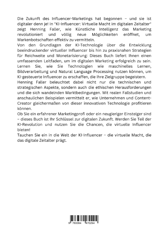 Die Zukunft des Influencer-Marketings hat begonnen - und sie ist digitaler denn je! In "KI-Influencer: Virtuelle Macht im digitalen Zeitalter" zeigt Henning Faller, wie Künstliche Intelligenz das Marketing revolutioniert und völlig neue Möglichkeiten eröffnet, um Markenbotschaften effektiv zu vermitteln.Von den Grundlagen der KI-Technologie über die Entwicklung beeindruckender virtueller Influencer bis hin zu praxisnahen Strategien für Reichweite und Monetarisierung: Dieses Buch liefert Ihnen einen umfassenden Leitfaden, um im digitalen Marketing erfolgreich zu sein. Lernen Sie, wie Sie Technologien wie maschinelles Lernen, Bildverarbeitung und Natural Language Processing nutzen können, um KI-gesteuerte Influencer zu erschaffen, die Ihre Zielgruppe begeistern.Henning Faller beleuchtet dabei nicht nur die technischen und strategischen Aspekte, sondern auch die ethischen Herausforderungen und die sich wandelnden Marktbedingungen. Mit realen Fallstudien und anschaulichen Beispielen vermittelt er, wie Unternehmen und Content-Creator gleichermaßen von dieser innovativen Technologie profitieren können.Ob Sie ein erfahrener Marketingprofi oder ein neugieriger Einsteiger sind - dieses Buch ist Ihr Schlüssel zur digitalen Zukunft. Werden Sie Teil der KI-Revolution und nutzen Sie die Chancen, die virtuelle Influencer bieten!Tauchen Sie ein in die Welt der KI-Influencer - die virtuelle Macht, die das digitale Zeitalter prägt.