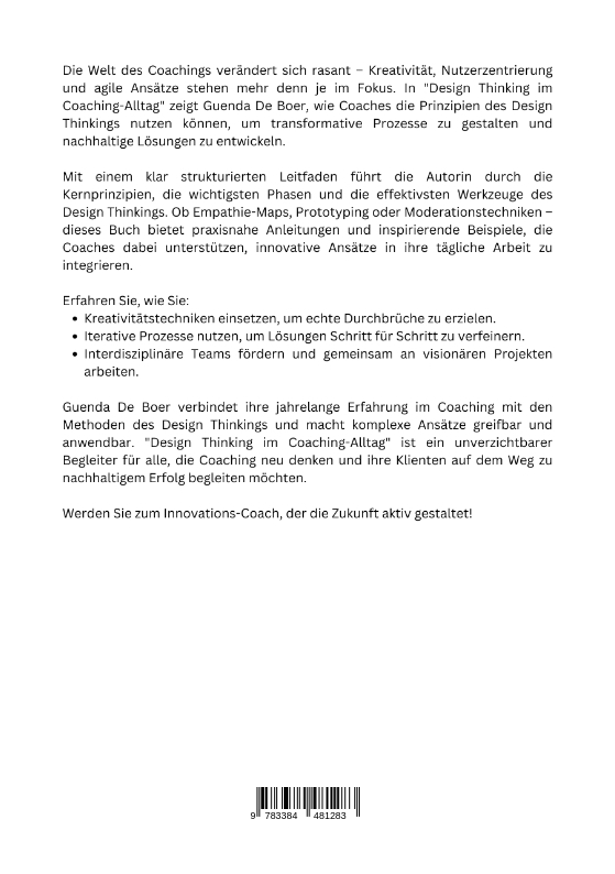 Die Welt des Coachings verändert sich rasant - Kreativität, Nutzerzentrierung und agile Ansätze stehen mehr denn je im Fokus. In "Design Thinking im Coaching-Alltag" zeigt Guenda De Boer, wie Coaches die Prinzipien des Design Thinkings nutzen können, um transformative Prozesse zu gestalten und nachhaltige Lösungen zu entwickeln.Mit einem klar strukturierten Leitfaden führt die Autorin durch die Kernprinzipien, die wichtigsten Phasen und die effektivsten Werkzeuge des Design Thinkings. Ob Empathie-Maps, Prototyping oder Moderationstechniken - dieses Buch bietet praxisnahe Anleitungen und inspirierende Beispiele, die Coaches dabei unterstützen, innovative Ansätze in ihre tägliche Arbeit zu integrieren.Erfahren Sie, wie Sie:Kreativitätstechniken einsetzen, um echte Durchbrüche zu erzielen.Iterative Prozesse nutzen, um Lösungen Schritt für Schritt zu verfeinern.Interdisziplinäre Teams fördern und gemeinsam an visionären Projekten arbeiten.Guenda De Boer verbindet ihre jahrelange Erfahrung im Coaching mit den Methoden des Design Thinkings und macht komplexe Ansätze greifbar und anwendbar. "Design Thinking im Coaching-Alltag" ist ein unverzichtbarer Begleiter für alle, die Coaching neu denken und ihre Klienten auf dem Weg zu nachhaltigem Erfolg begleiten möchten.Werden Sie zum Innovations-Coach, der die Zukunft aktiv gestaltet!