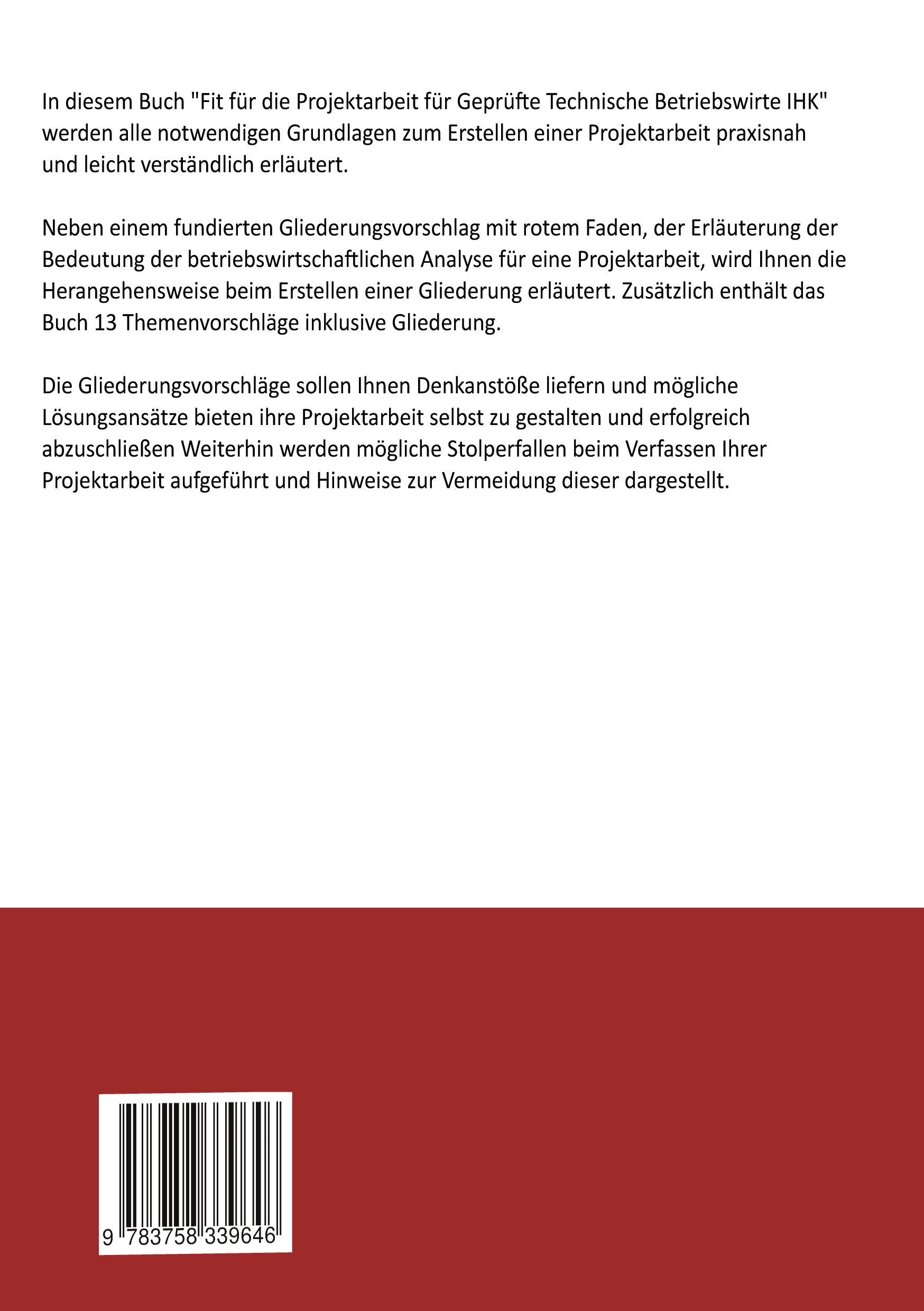 Zusätzlich enthält das Buch 13 Themenvorschläge inklusive Gliederung. Die Gliederungsvorschläge sollen Ihnen Denkanstöße liefern und mögliche Lösungsansätze bieten ihre Projektarbeit selbst zu gestalten und erfolgreich abzuschließen.