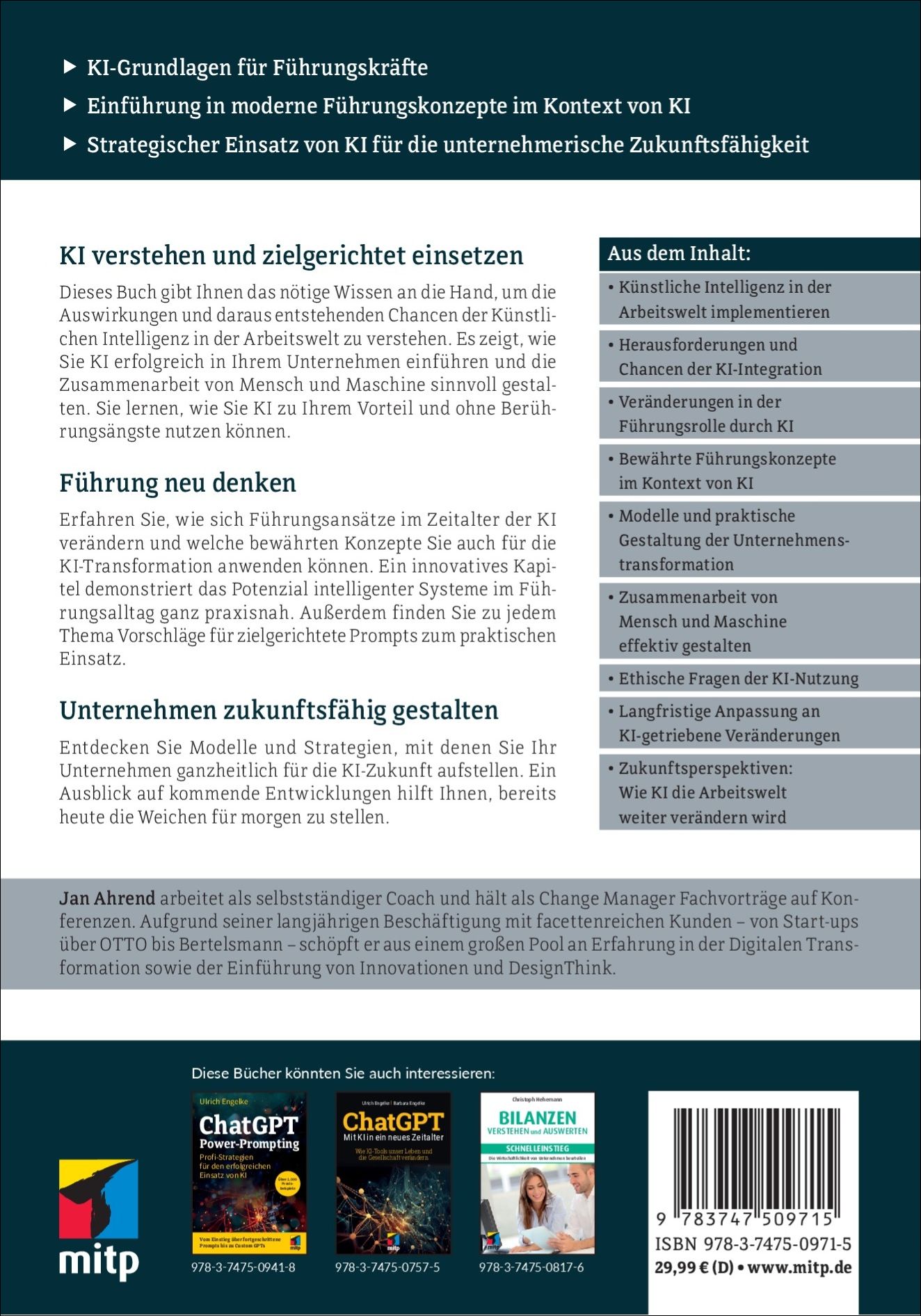 | Schlagworte | Agil • Agile Coach • Agility • AI • Buch • Bücher • business • Coach • Coaching • Führen • Führung • Führungskräfte Coaching • KI • Künstliche Intelligenz • Lean • Management • mitp • Projektmanagement • Team • Unternehmen |