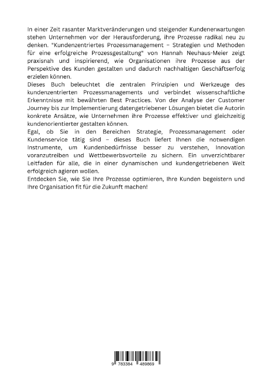 In einer Zeit rasanter Marktveränderungen und steigender Kundenerwartungen stehen Unternehmen vor der Herausforderung, ihre Prozesse radikal neu zu denken. "Kunden-zentriertes Prozessmanagement - Strategien und Methoden für eine erfolgreiche Prozessgestaltung" von Hannah Neuhaus-Meier zeigt praxisnah und inspirierend, wie Organisationen ihre Prozesse aus der Perspektive des Kunden gestalten und dadurch nachhaltigen Geschäftserfolg erzielen können.Dieses Buch beleuchtet die zentralen Prinzipien und Werkzeuge des kundenzentrierten Prozessmanagements und verbindet wissenschaftliche Erkenntnisse mit bewährten Best Practices. Von der Analyse der Customer Journey bis zur Implementierung datengetriebener Lösungen bietet die Autorin konkrete Ansätze, wie Unternehmen ihre Prozesse effektiver und gleichzeitig kundenorientierter gestalten können.Egal, ob Sie in den Bereichen Strategie, Prozessmanagement oder Kundenservice tätig sind - dieses Buch liefert Ihnen die notwendigen Instrumente, um Kundenbedürfnisse besser zu verstehen, Innovation voranzutreiben und Wettbewerbsvorteile zu sichern. Ein unverzichtbarer Leitfaden für alle, die in einer dynamischen und kundengetriebenen Welt erfolgreich agieren wollen.Entdecken Sie, wie Sie Ihre Prozesse optimieren, Ihre Kunden begeistern und Ihre Organisation fit für die Zukunft machen!