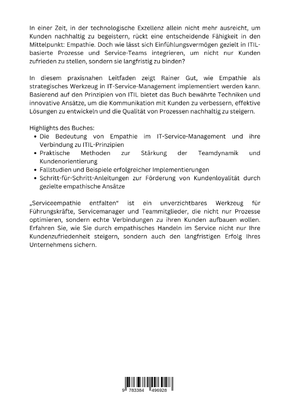In einer Zeit, in der technologische Exzellenz allein nicht mehr ausreicht, um Kunden nachhaltig zu begeistern, rückt eine entscheidende Fähigkeit in den Mittelpunkt: Empathie. Doch wie lässt sich Einfühlungsvermögen gezielt in ITIL-basierte Prozesse und Service-Teams integrieren, um nicht nur Kunden zufrieden zu stellen, sondern sie langfristig zu binden?In diesem praxisnahen Leitfaden zeigt Rainer Gut, wie Empathie als strategisches Werk-zeug in IT-Service-Management implementiert werden kann. Basierend auf den Prinzipien von ITIL bietet das Buch bewährte Techniken und innovative Ansätze, um die Kommunikation mit Kunden zu verbessern, effektive Lösungen zu entwickeln und die Qualität von Prozessen nachhaltig zu steigern.Highlights des Buches:Die Bedeutung von Empathie im IT-Service-Management und ihre Verbindung zu ITIL-PrinzipienPraktische Methoden zur Stärkung der Teamdynamik und KundenorientierungFallstudien und Beispiele erfolgreicher ImplementierungenSchritt-für-Schritt-Anleitungen zur Förderung von Kundenloyalität durch gezielte empathische Ansätze"Serviceempathie entfalten" ist ein unverzichtbares Werkzeug für Führungskräfte, Servicemanager und Teammitglieder, die nicht nur Prozesse optimieren, sondern echte Verbindungen zu ihren Kunden aufbauen wollen. Erfahren Sie, wie Sie durch empathisches Handeln im Service nicht nur Ihre Kundenzufriedenheit steigern, sondern auch den langfristigen Erfolg Ihres Unternehmens sichern.